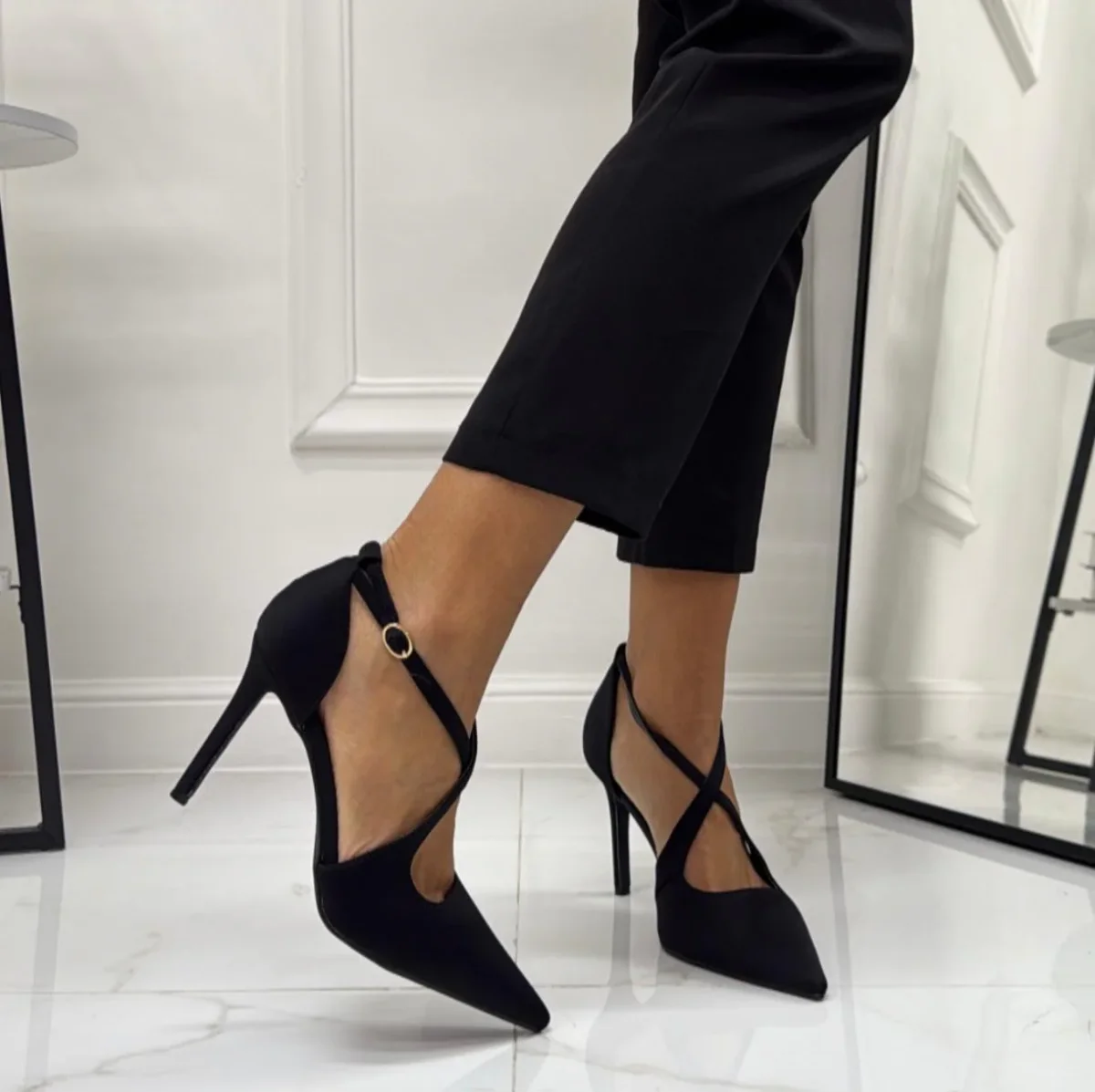 COLORI: NERO – LEOPARDATO Décolleté a punta con tacco sottile e slanciato. Presentano un motivo maculato e una fascia incrociata sul collo del piede, regolata da una piccola fibbia laterale. La silhouette è elegante e affusolata, pensata per valorizzare la gamba e dare un tocco deciso al look. Ha una calzatura regolare.