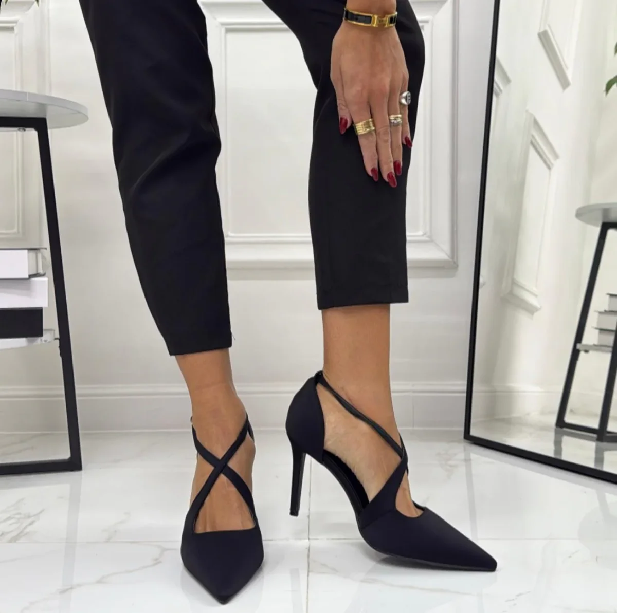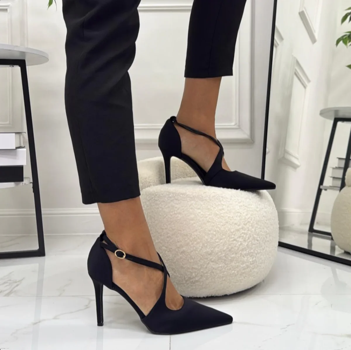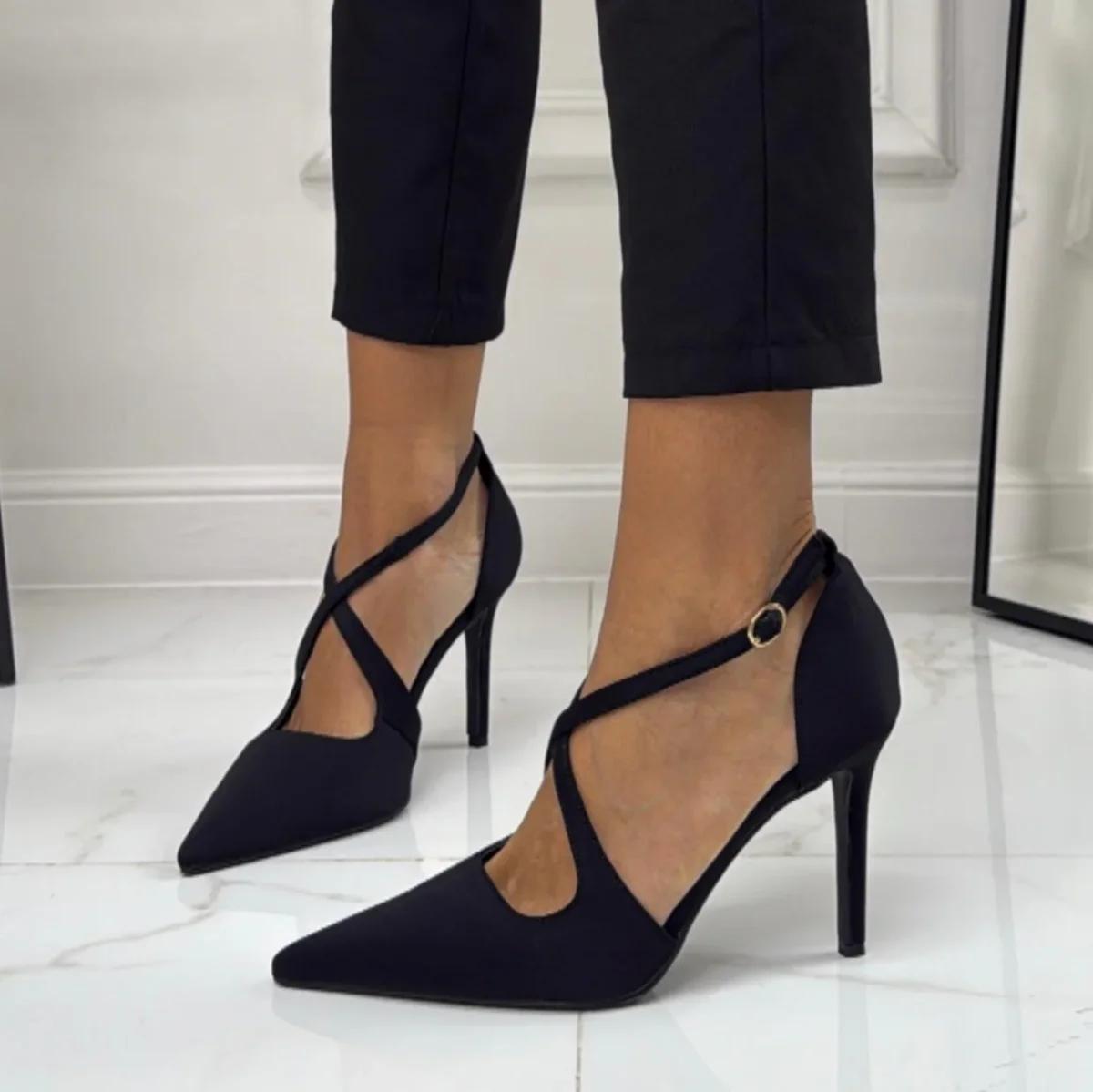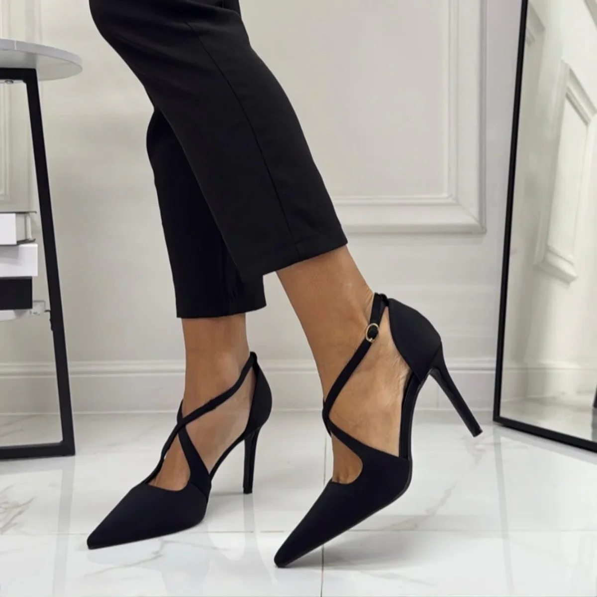Décolleté a punta con tacco sottile e slanciato. Presentano un motivo maculato e una fascia incrociata sul collo del piede, regolata da una piccola fibbia laterale. La silhouette è elegante e affusolata, pensata per valorizzare la gamba e dare un tocco deciso al look. Ha una calzatura regolare.