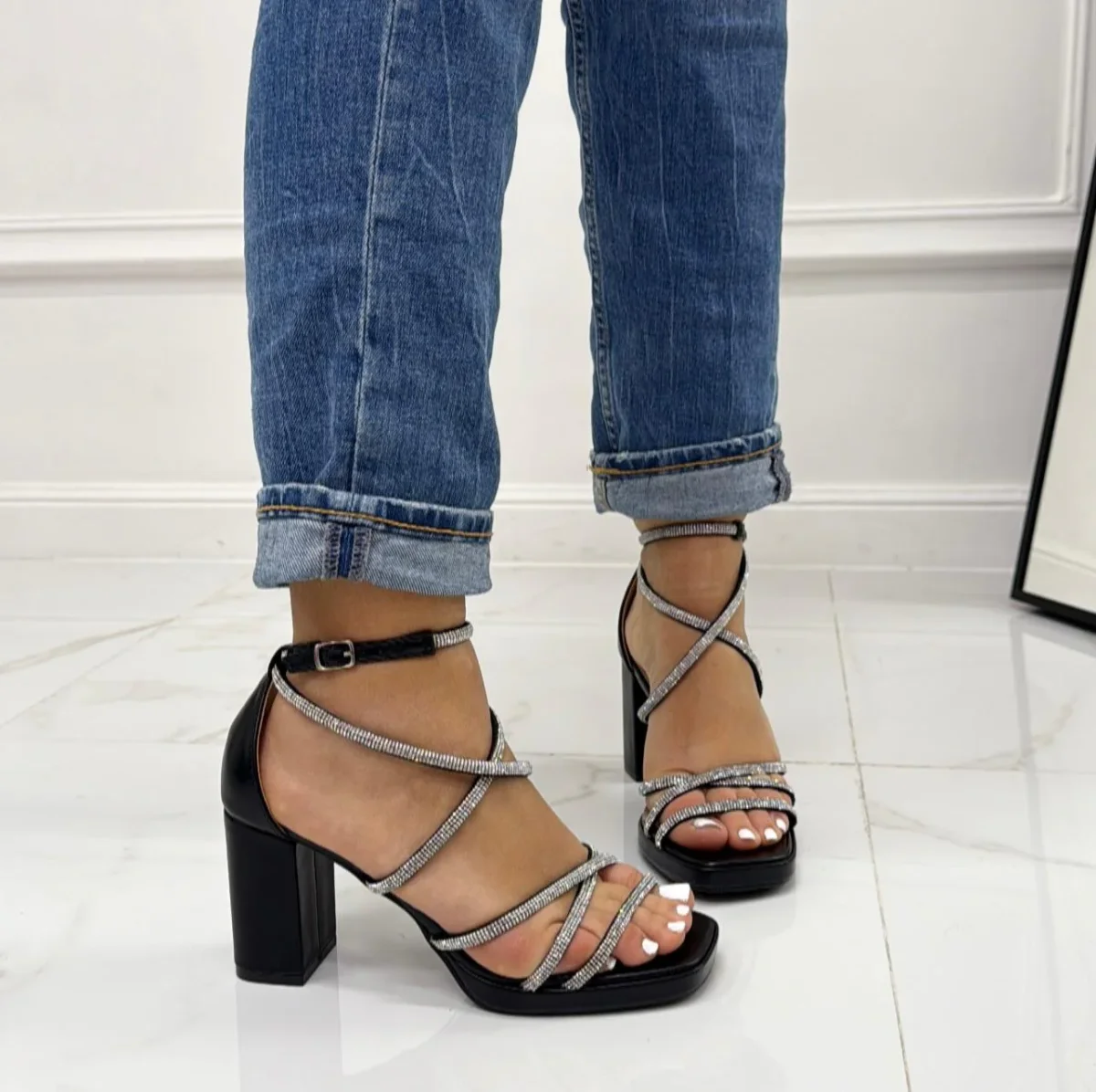 Questo sandalo dona al piede un effetto elegante e fine. Le sue caratteristiche sono: il modello con fasce incrociate brillantinate , con punta e tacco quadrato alto 8 cm, molto comodo per ogni occasione. Non ti stancherai mai di portarli, e sarai sempre all’ultima moda. Perfetto per abiti corti o gonne in modo da poter valorizzare i lacci incrociandoli a proprio gusto. Puรฒ essere adatto per eventi come: feste, party, cocktail party, brunch e cerimonie.