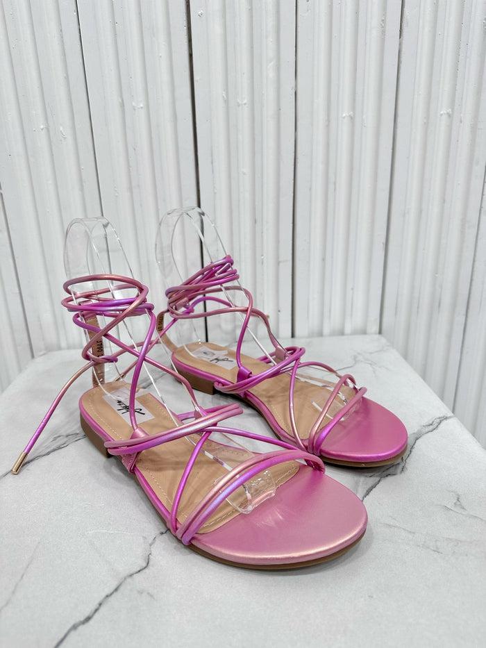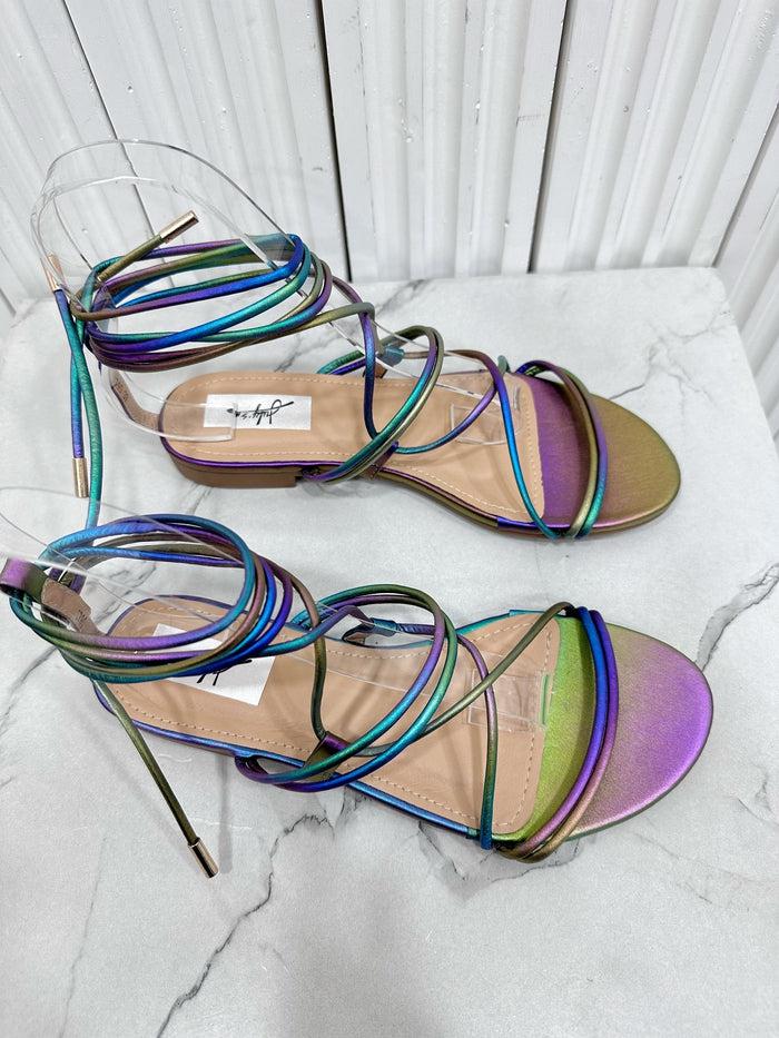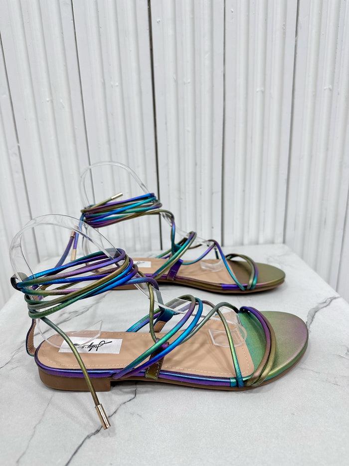 Sandalo con lacci di CURTAIN: realizzato in materiale laminato e con un tacco di 1 cm, un plateau di 0,5 cm e una vestibilitร regolare. Un modello elegante e resistente, perfetto per la bella stagione.