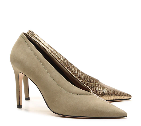 REF: 1415007.2 THE ESSENTIALS, DNA VCZ NABUK VERDE OLIVA E STAMPA PITONE ORO EFFETTO BRUNITO C-O-O-L FORMA A PUNTA TACCO STILETTO (ALTEZZA 90 MM) SUOLA CUOIO Consegna entro 2/5 giorni lavorativi FITTING: Questo modello ha una calzata piรน piccola si consiglia di acquistare un numero maggiore rispetto al proprio