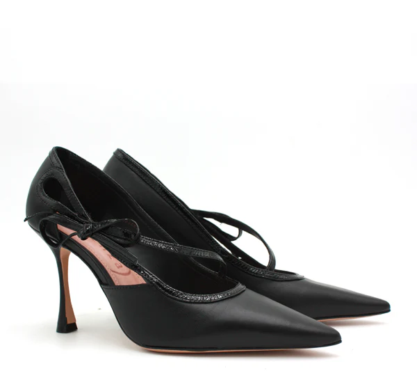 Strepitosa décolleté con taglio e fiocco sulla parte esterna, elegante contrasto tra la tomaia in pelle e profilo in vernice.