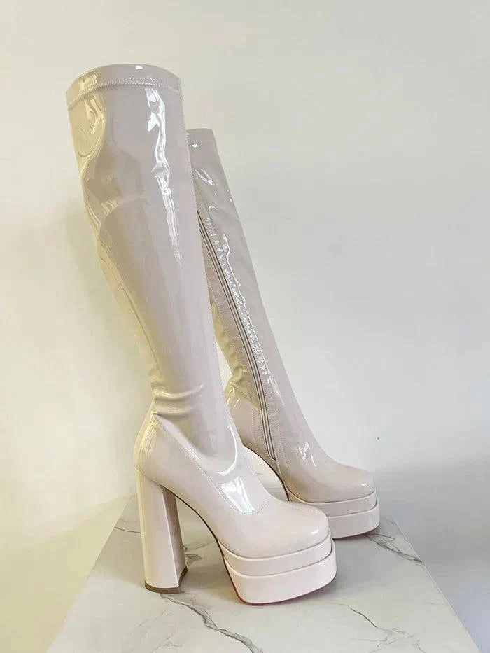 Materiale: vernice lucida con imbottitura Altezza tacco: 14cm Altezza plateau: 5cm Circonferenza gambale: 35cm Circonferenza polpaccio: 30cm Altezza stivale: 42cm Vestibilitร : CALZATA REGOLARE (se oscilli tra due numeri consigliamo un numero piรน grande) N.B.: per questo prodotto in saldi non รจ disponibile il cambio numero gratuito.