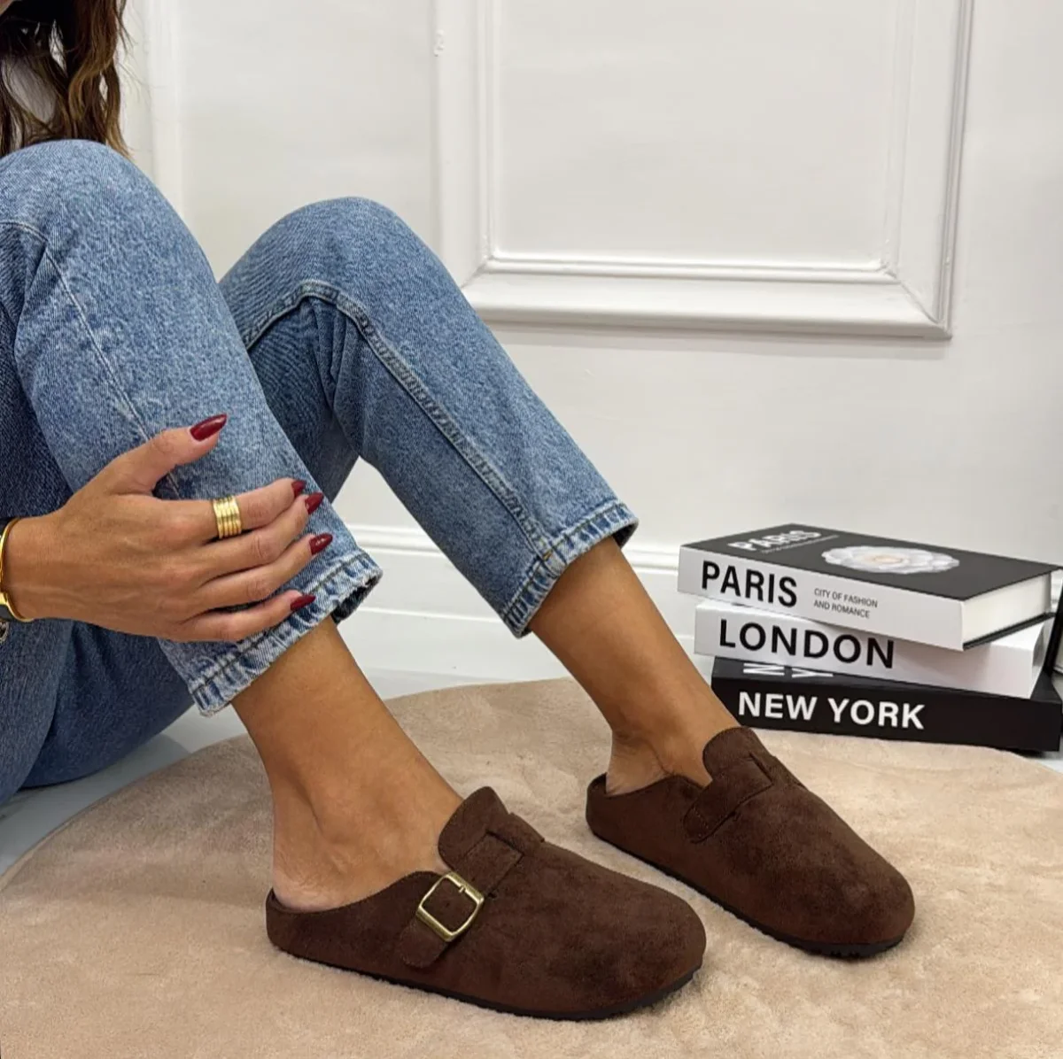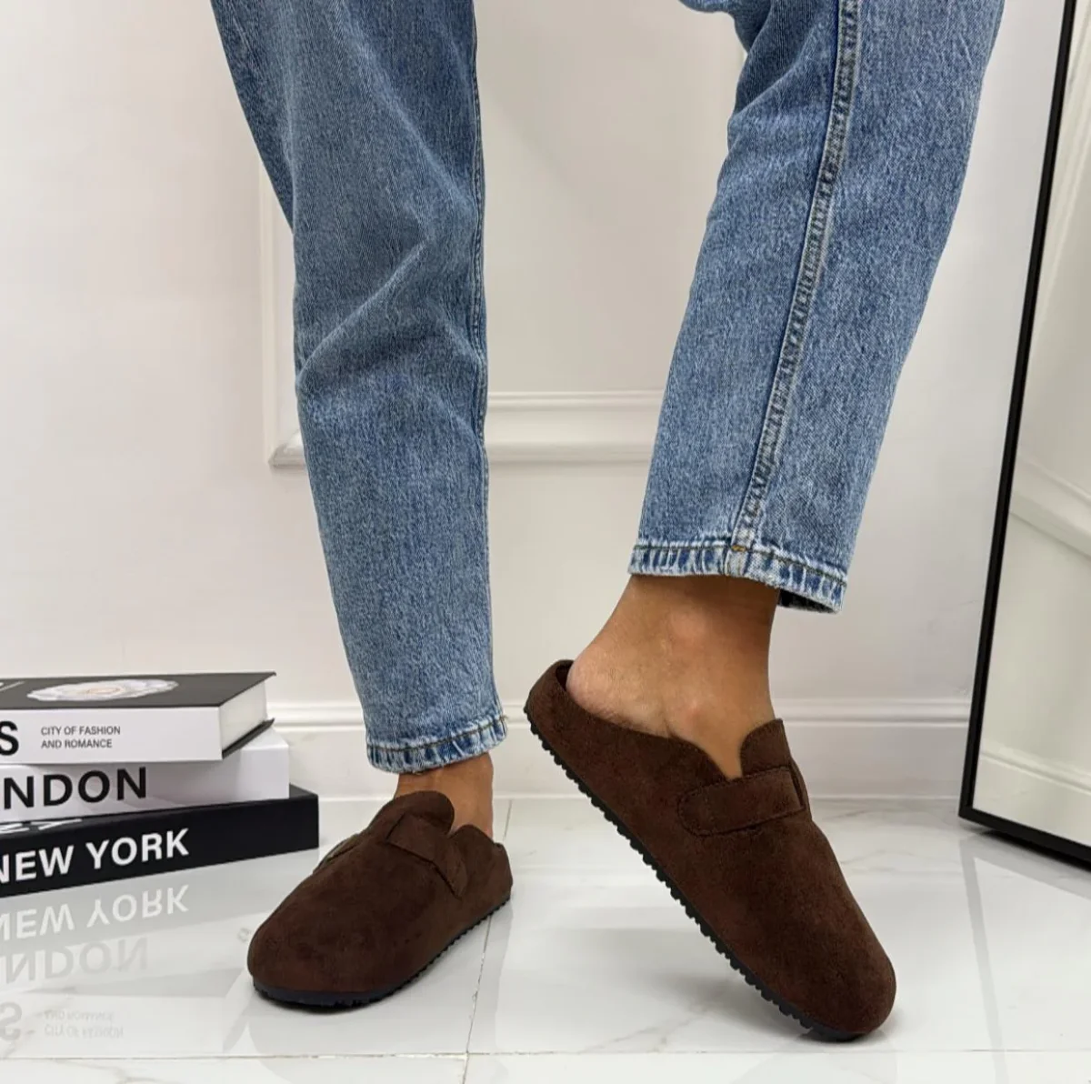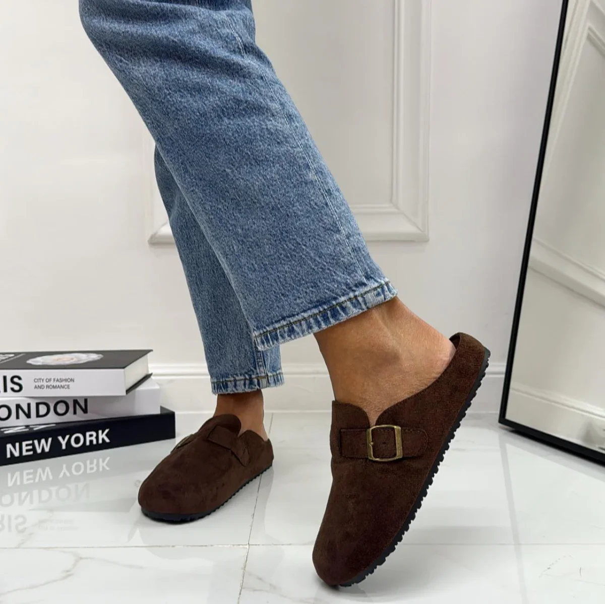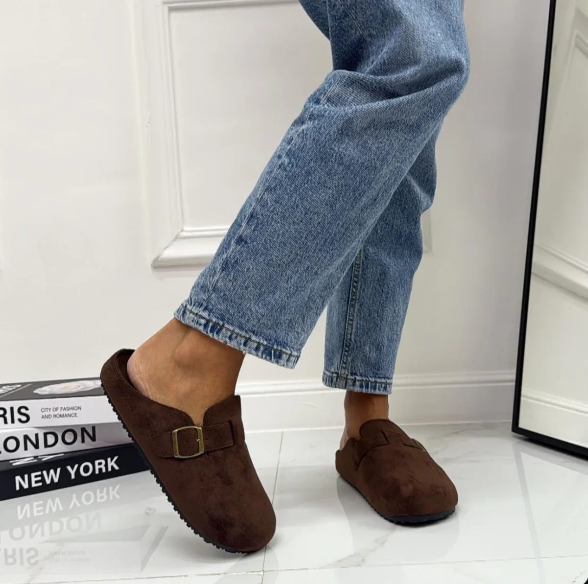 Comode e versatili, queste ciabatte in stile sabot sono realizzate in morbido materiale effetto camoscio. Presentano una fibbia regolabile laterale che permette una calzata personalizzata e una suola ergonomica che assicura comfort durante tutta la giornata. Il colore neutro le rendono perfette sia per un look casual con jeans che per un abbinamento piรน rilassato in casa o nel tempo libero. Hanno una calzata regolare.