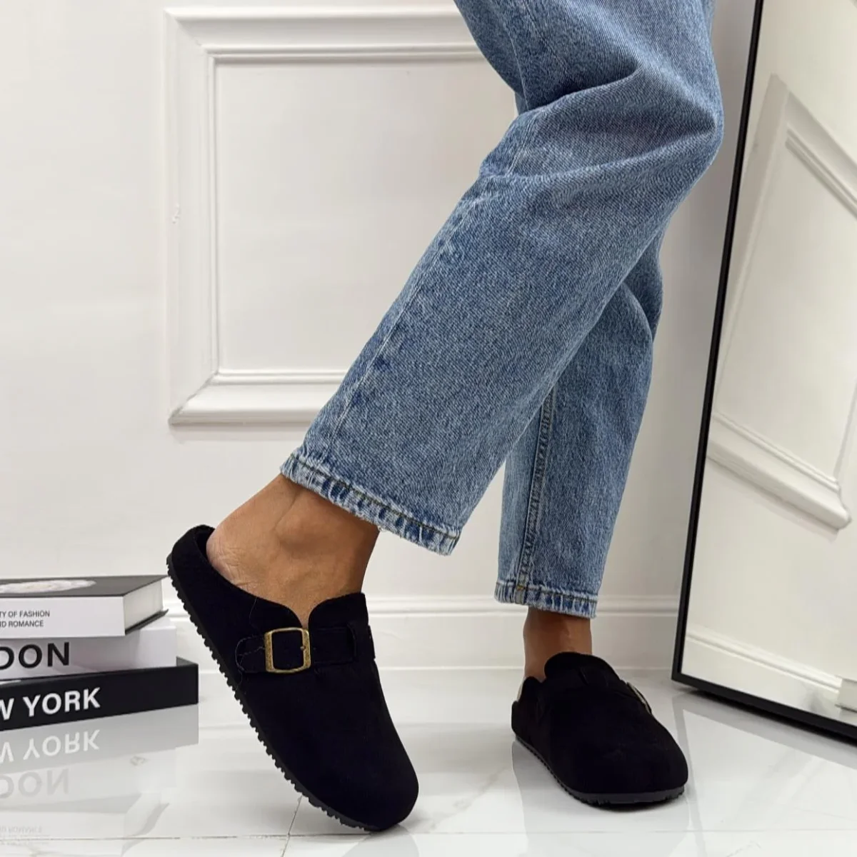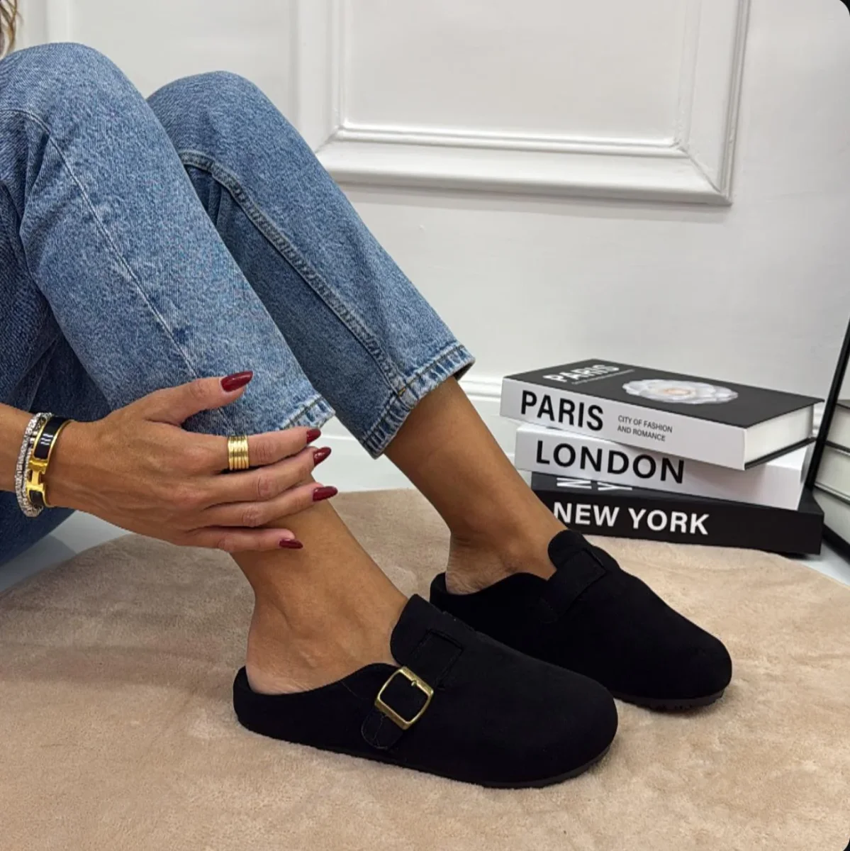 Comode e versatili, queste ciabatte in stile sabot sono realizzate in morbido materiale effetto camoscio. Presentano una fibbia regolabile laterale che permette una calzata personalizzata e una suola ergonomica che assicura comfort durante tutta la giornata. Il colore neutro le rendono perfette sia per un look casual con jeans che per un abbinamento piรน rilassato in casa o nel tempo libero. Hanno una calzata regolare.
