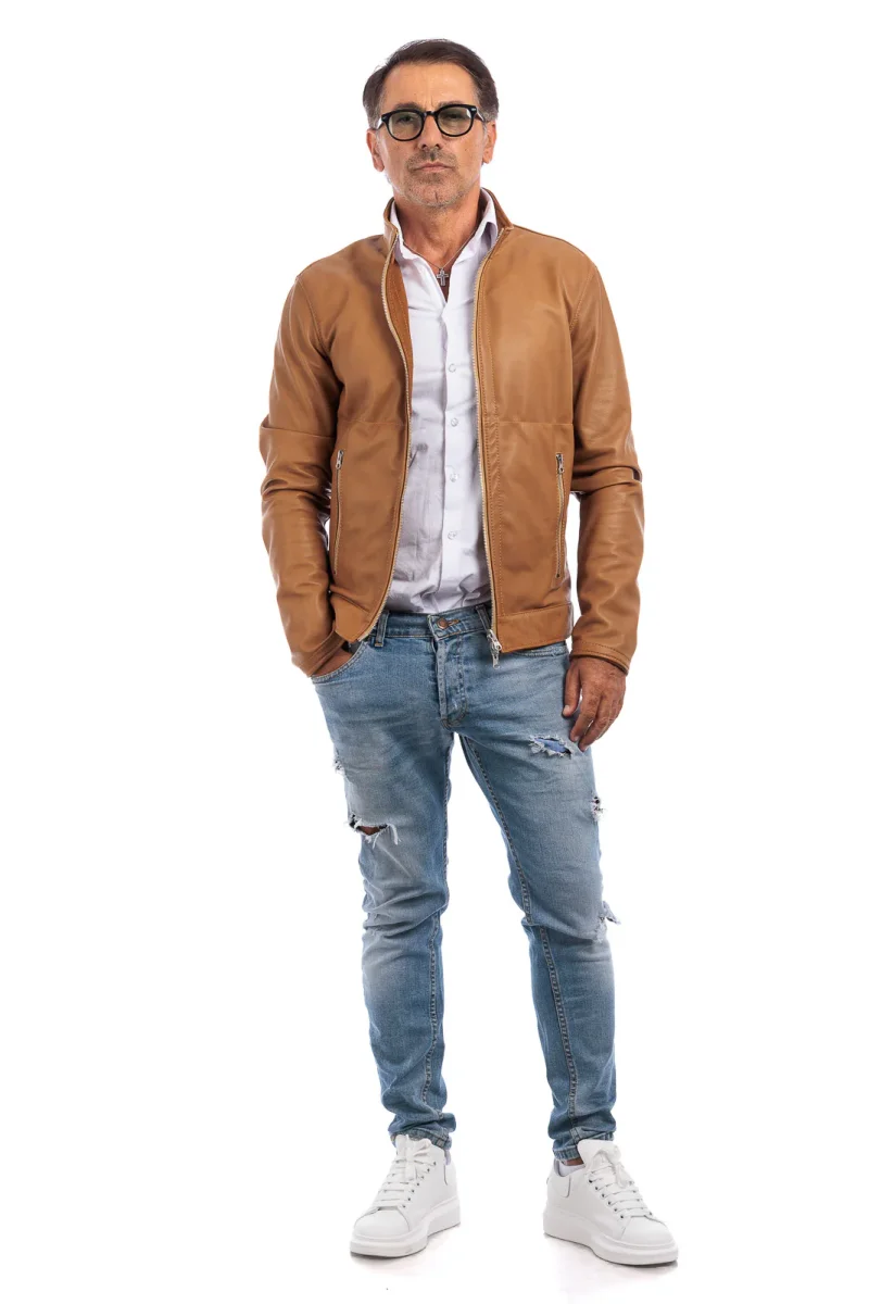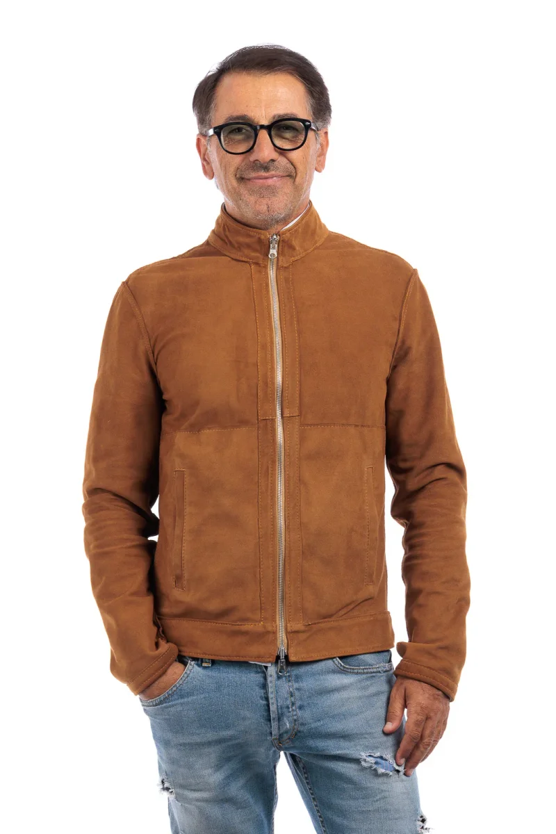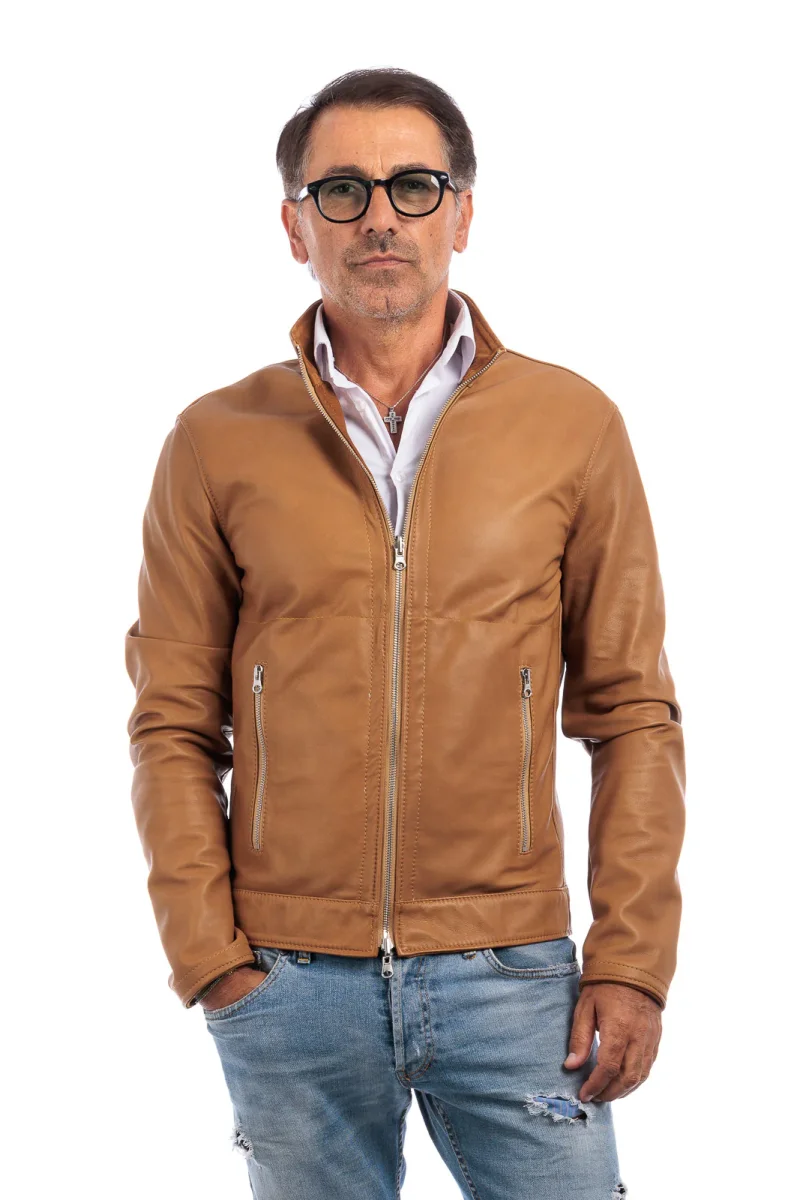Giacca in Pelle Vera – Modello: biker double face idrorepellente 100% Made in Italy Pellame: Camoscio di Renna idrorepellente e pelle biscotto Il modello in foto รจ taglia 50.