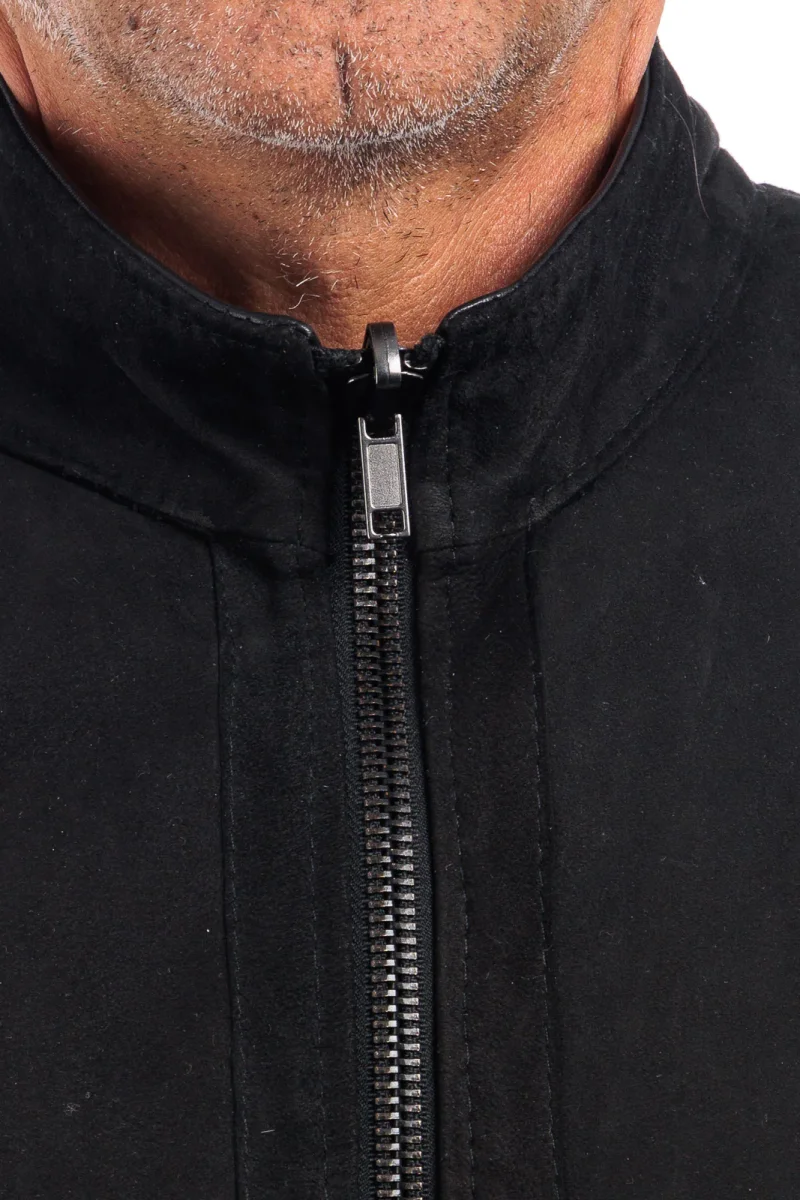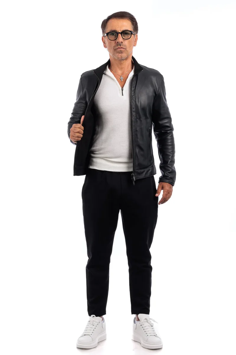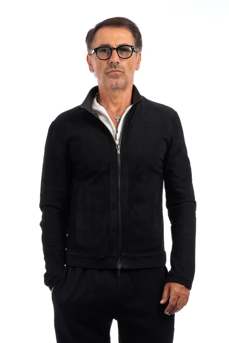Giacca in Pelle Vera – Modello: Biker double face idrorepellente 100% Made in Italy Pellame: Camoscio di Renna idrorepellente e pelle nero Il modello in foto รจ taglia 50.