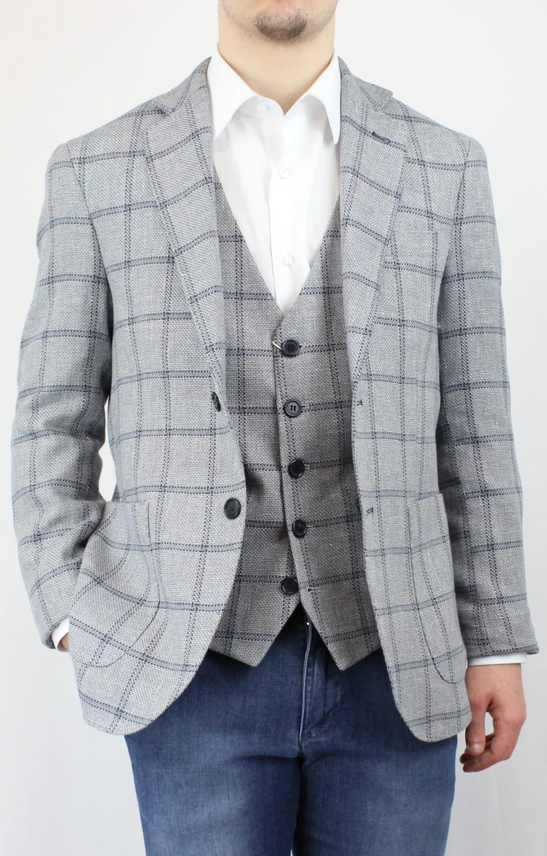 Questa Giacca Check Armaturata รจ perfetta per chi cerca un look elegante e moderno allo stesso tempo. Il tessuto armaturato e il misto lino garantiscono resistenza e freschezza, ideali per le giornate piรน calde. La fantasia a quadri conferisce un tocco di originalitร e stile. Disponibile anche il panciotto abbinato