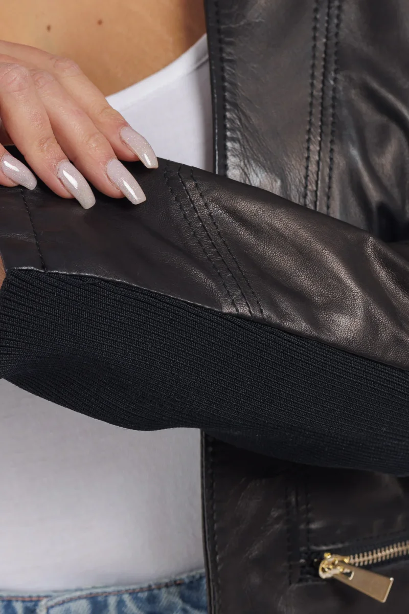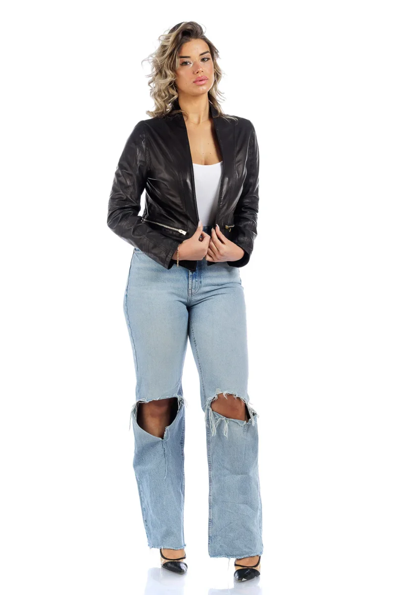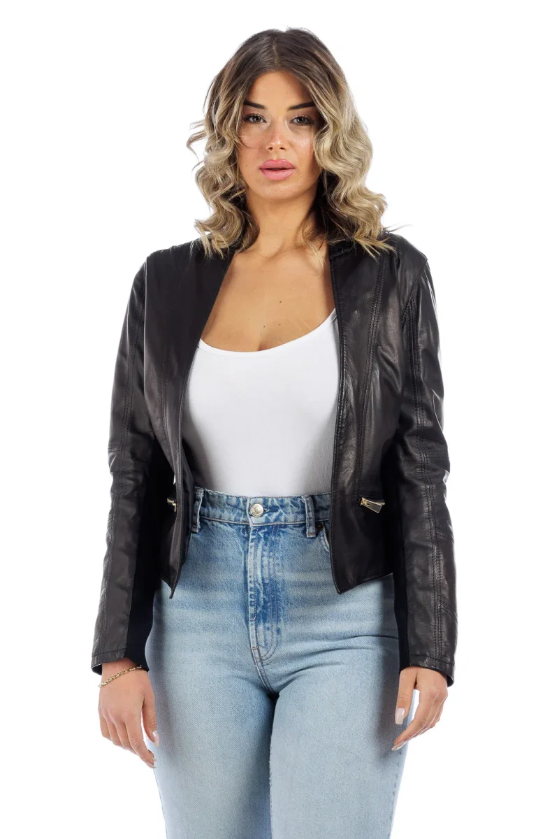 Giacca in Pelle Vera – Modello: Giubbino corpetto lungo nero 100% Made in Italy Pellame: Agnello Sottomanica in lana elasticizzata Accessori: Zip Oro La modella in foto รจ taglia 44.