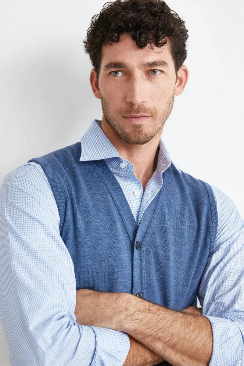 Gilet con bottoni da uomo in lana merino, un capo versatile che unisce lo stile allโ eleganza senza tempo. Perfetto per chi cerca calore e comfort, รจ caratterizzato da uno scollo a V, unโabbottonatura frontale e rifiniture sul fondo, progettate per mantenere lโintegritร del tessuto anche dopo numerosi lavaggi. Realizzato in 100% lana merinos Harmony del prestigioso Lanificio di Tollegno, questo cardigan offre una lucentezza naturale e una resistenza eccezionale. La vestibilitร slim e la varietร di colori a disposizione, lo rendono ideale per un look moderno e raffinato, adatto ad ogni occasione. Perfetto in abbinamento ad un pantalone e camicia Il Lanificio. Interamente Made in Italy, รจ pensato per lโuomo che desidera qualitร e durabilitร . Il modello รจ alto 189 cm e indossa la taglia 50.