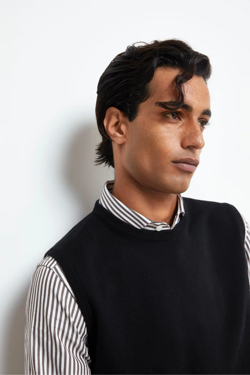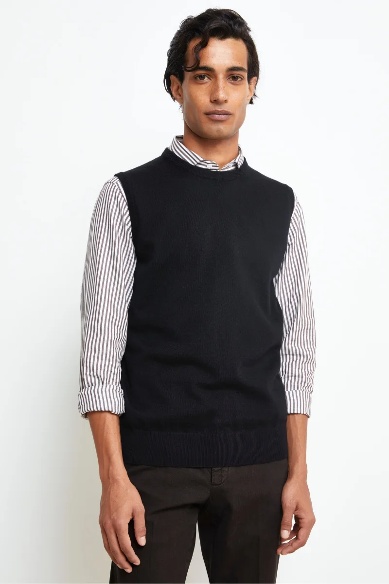 Gilet girocollo in lana merino da uomo, un capo essenziale ed elegante, perfetto per chi desidera un look sofisticato e senza tempo. Realizzato interamente in Italia, rappresenta lโeccellenza del Made in Italy, con una cura impeccabile per i dettagli e una qualitร superiore. La maglia รจ confezionata con la prestigiosa lana merinos extrafine Harmony del Lanificio di Tollegno, un tessuto che garantisce non solo resistenza e lucentezza, ma anche comfort e calore, ottimali per le stagioni piรน fredde. Disponibile in diverse colorazioni, il Gilet in maglia, si adatta a qualsiasi occasione: abbinato a un denim per un look casual o sopra una camicia per un outfit elegante. Un capo versatile che non puรฒ mancare nel guardaroba di chi cerca stile e funzionalitร . Il modello รจ alto 184 cm e indossa la taglia 50.