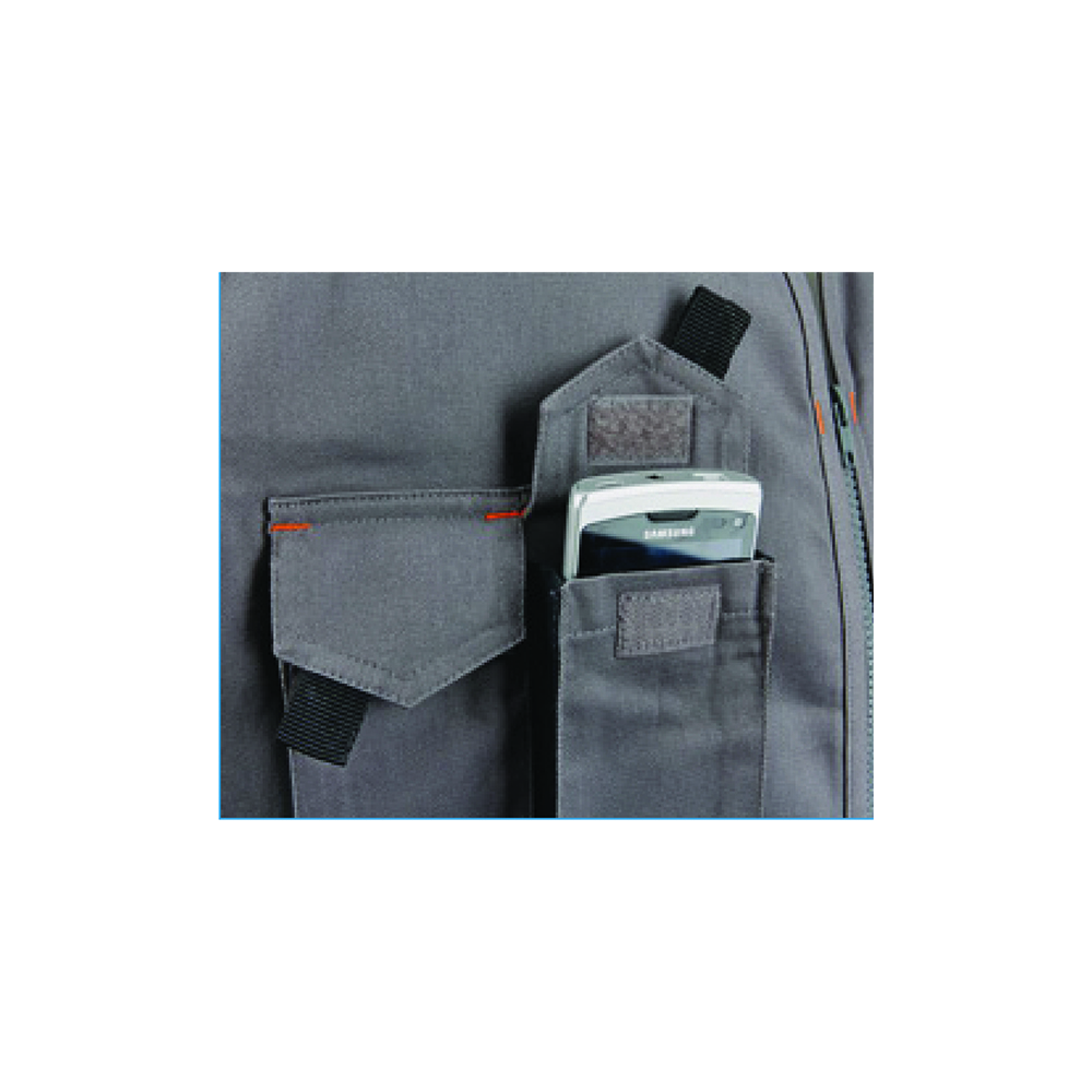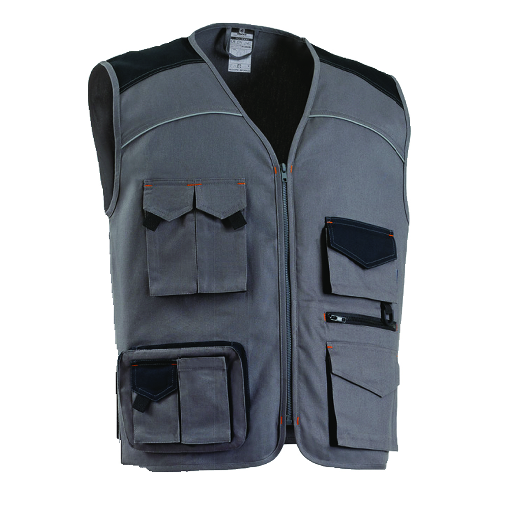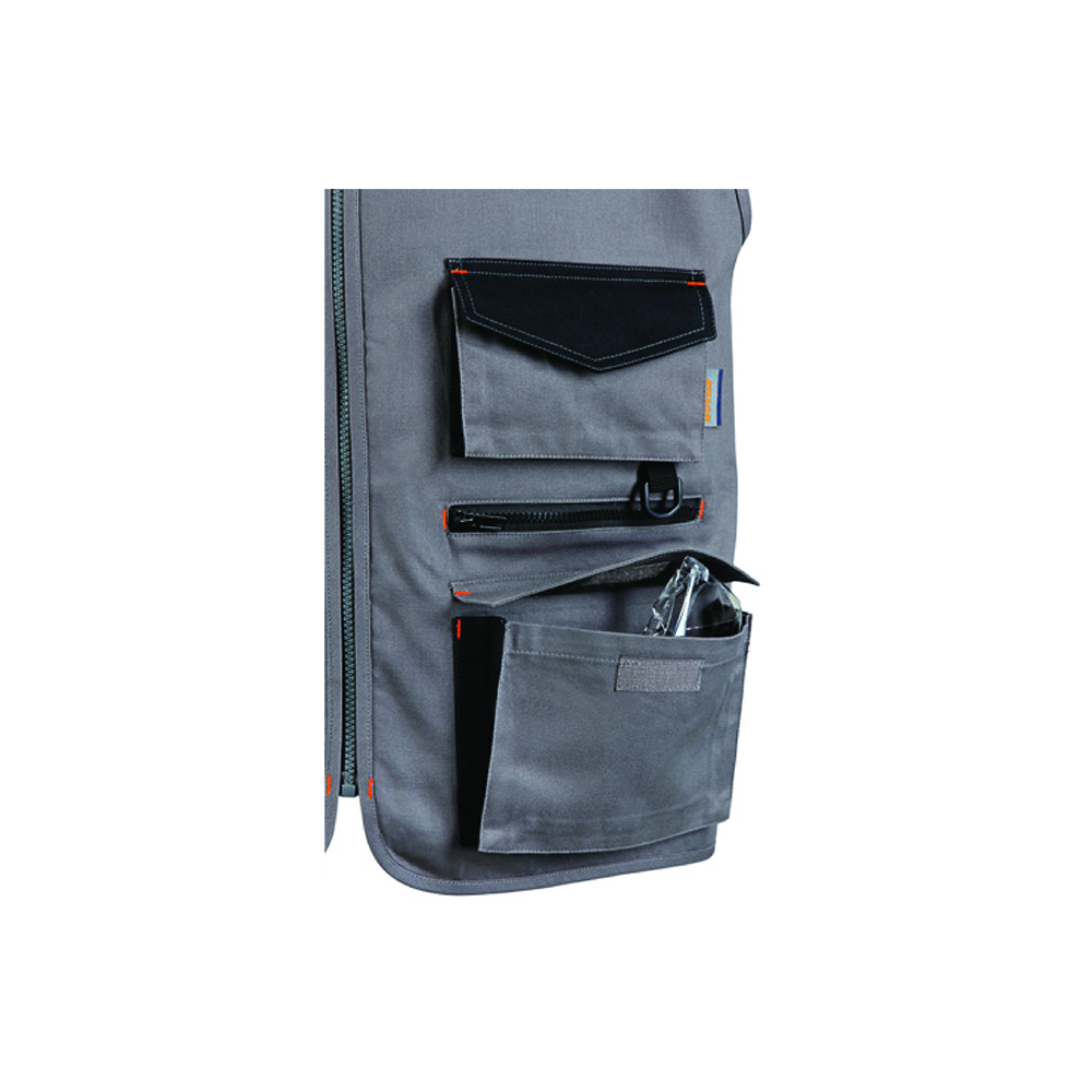 Gilet multitasche Doppio taschino e tasca sul petto Due tasconi di cui uno chiuso da cerniera, una tasca con zip e fodera rinforzata per utensili. Ampia tasca posteriore con cerniera. Tessuto: 100% cotone | 240 gr/mq