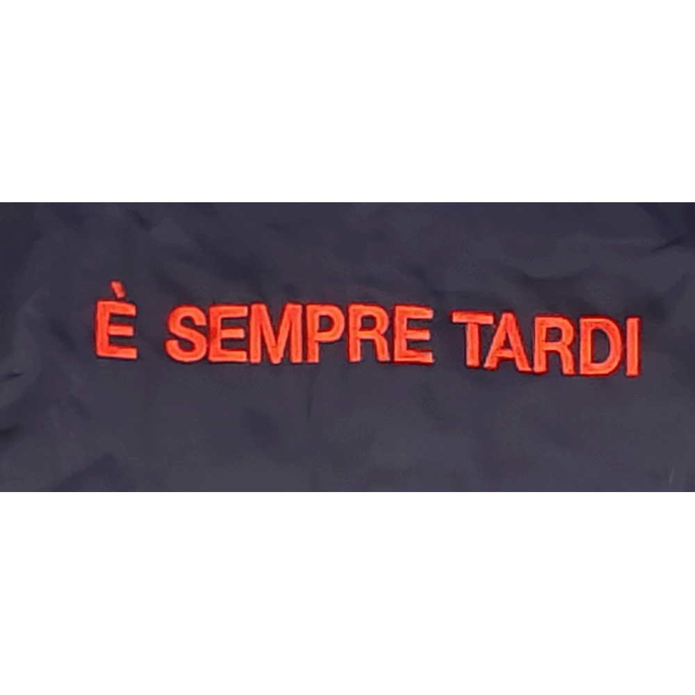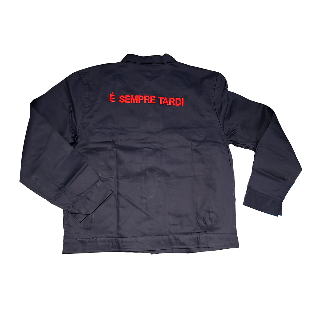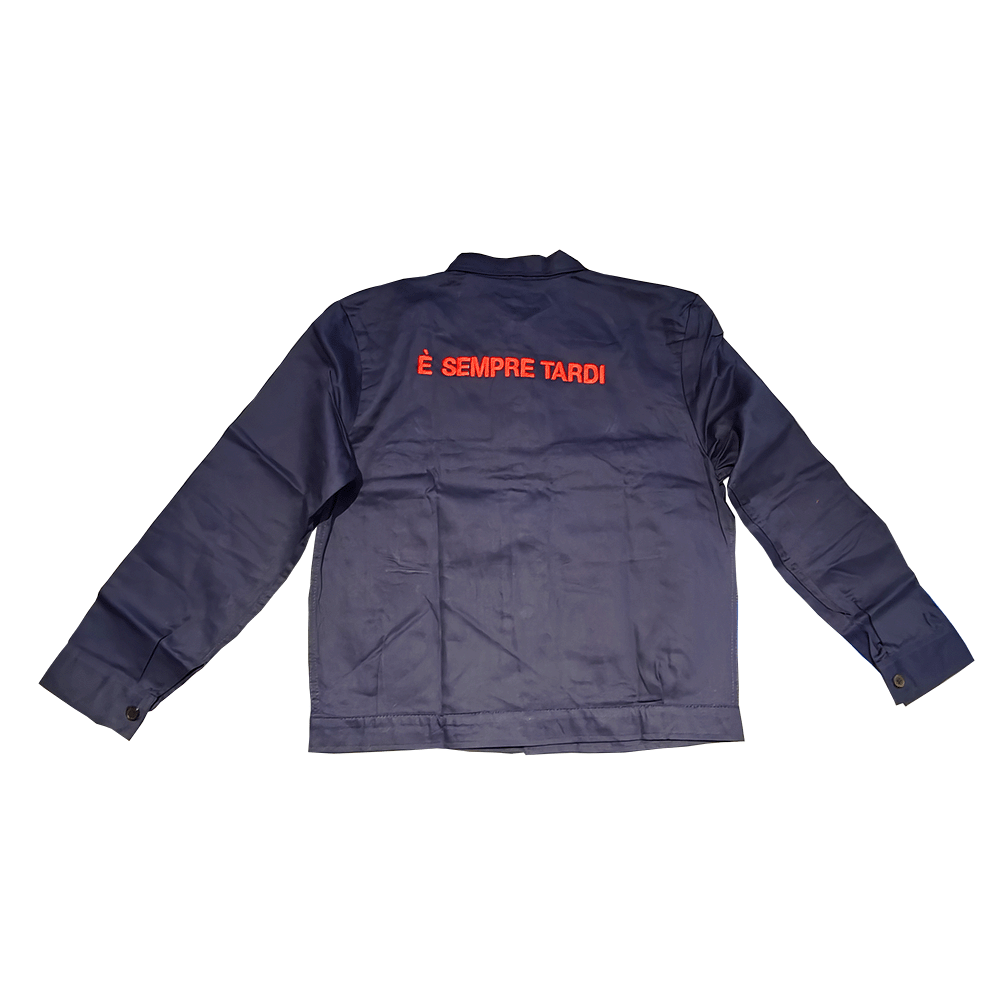 Giubbino in 100% cotone massaua colore blu con ricamo sulla schiena È SEMPRE TARDI, realizzato nell’ambito dell’evento FUORI DAL CENTRO.