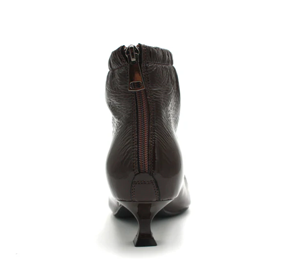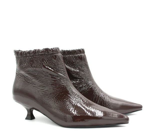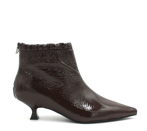 REF: GRETA-D5 Un tronchetto morbidissimo. In vernice, arricciato alla caviglia. Zip sul retro. Tomaia pelle. Forma a punta. Tacco dipinto (altezza 30 mm). Suola gomma FITTING: Questo modello ha una calzata regolare GUIDA ALLE TAGLIE