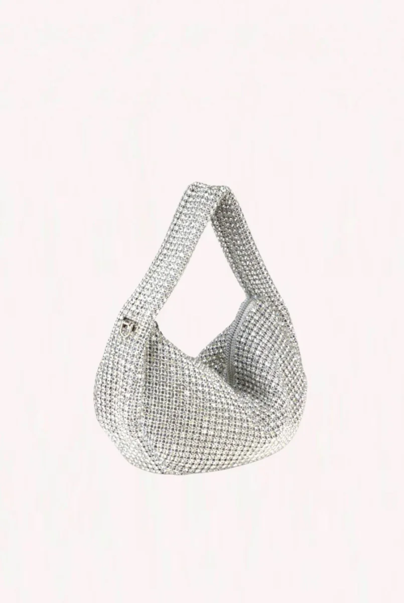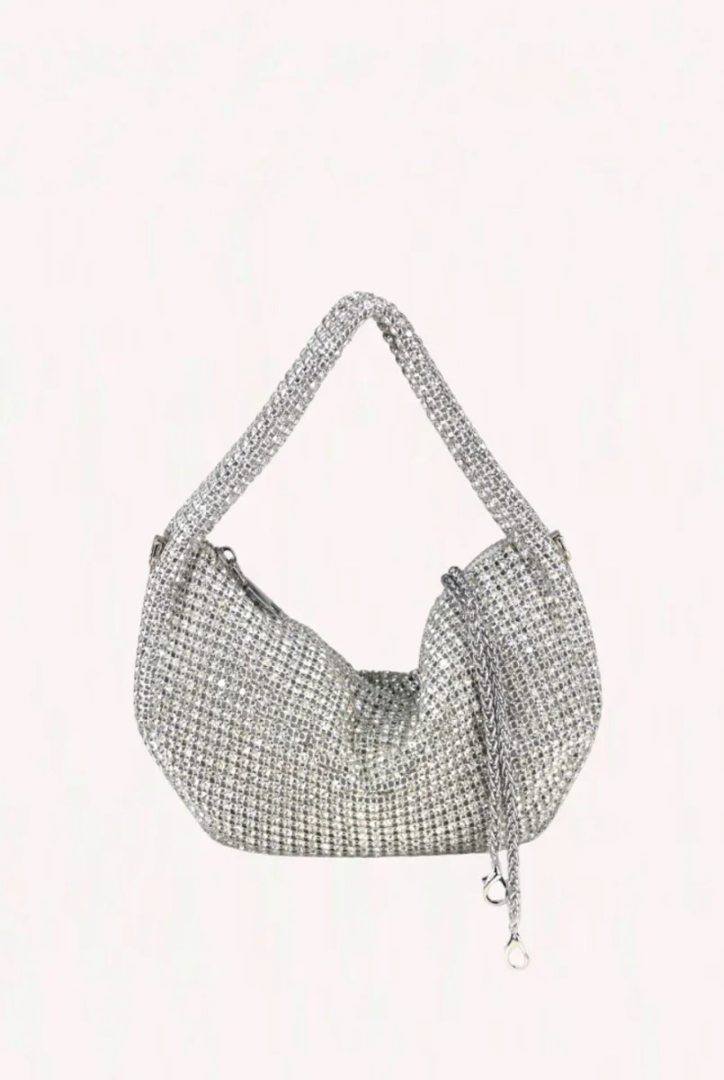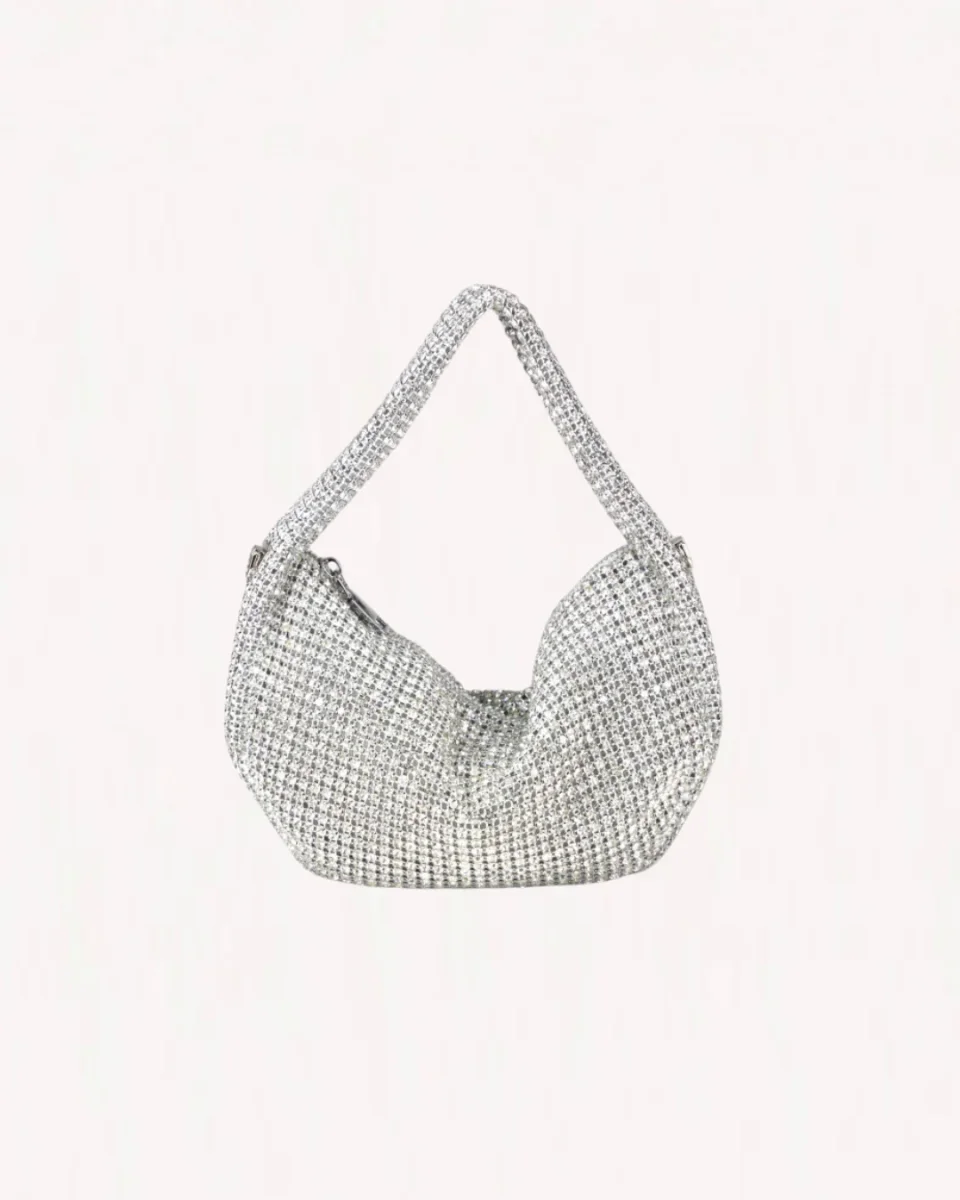 Hobo bag in strass color argento dal design elegante e luminoso, perfetta per aggiungere un tocco glamour a qualsiasi look. La silhouette morbida e femminile si abbina alla brillantezza degli strass, creando un accessorio raffinato e di grande impatto.