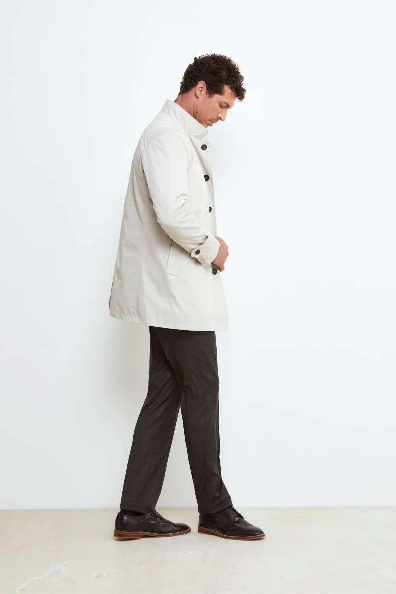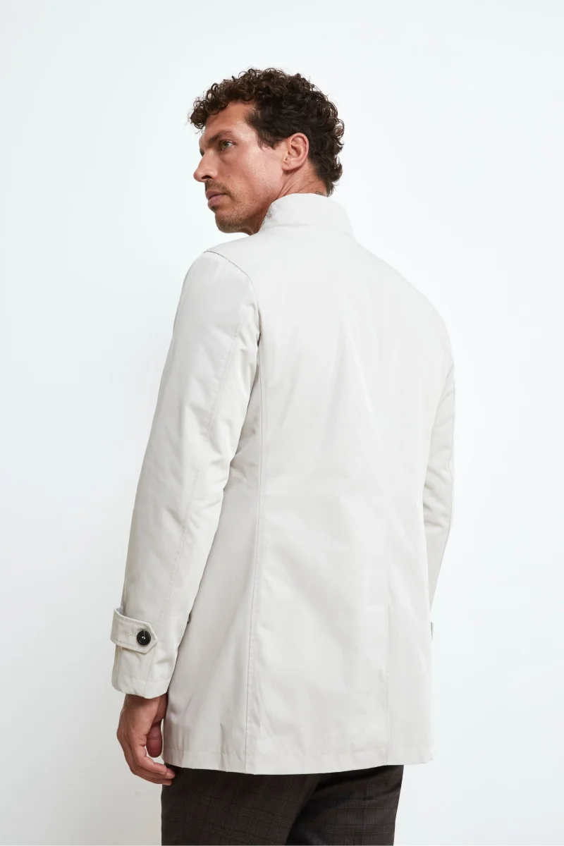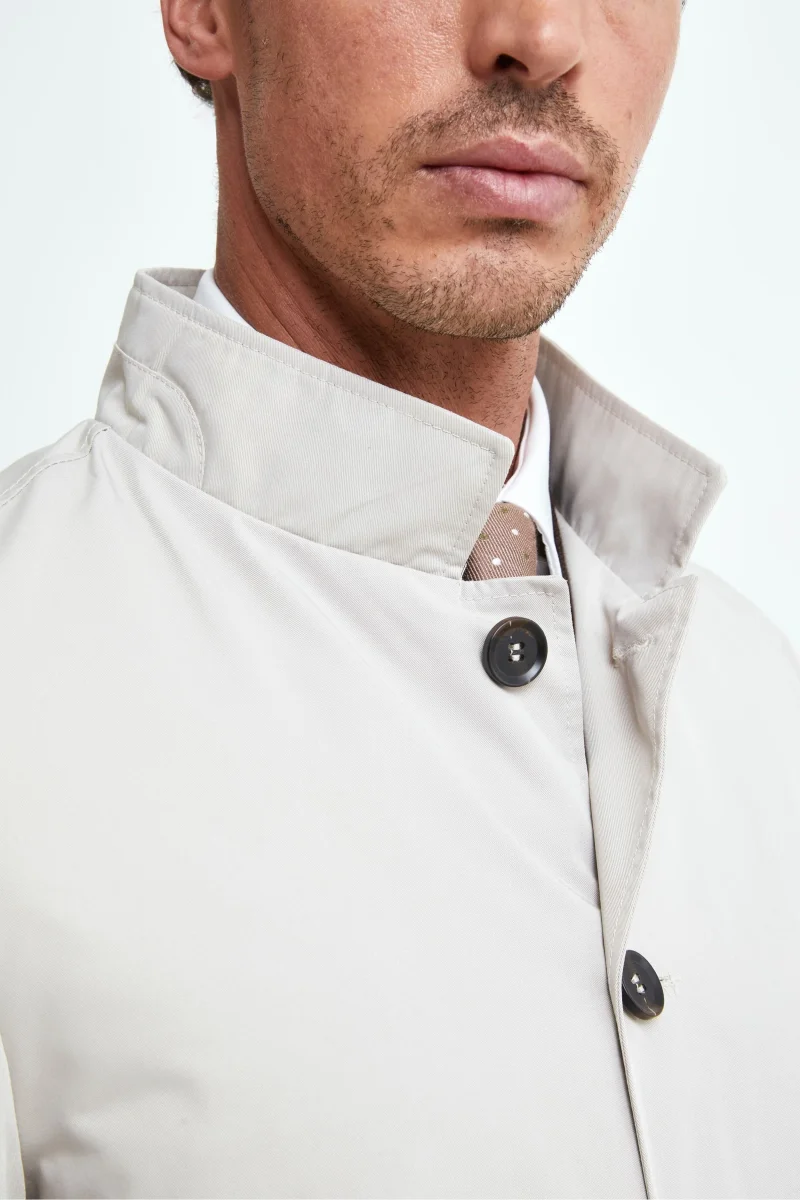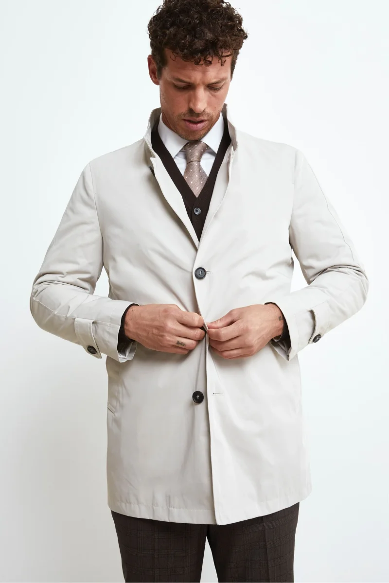 Impermeabile monopetto da uomo con gilet interno removibile: funzionalitร  e stile in ogni stagione. Questo impermeabile color ghiaccio da uomo รจ realizzato in tessuto tecnico idrorepellente ed รจ dotato di una trapunta interna removibile, perfetta per adattarsi ai cambi di stagione. La linea pulita e contemporanea รจ arricchita da dettagli sartoriali come il revers classico, la chiusura a cinque bottoni e le pratiche tasche a filo oblique. Sul retro, uno spacchetto centrale con bottone a pressione assicura maggiore libertร  di movimento. La vestibilitร  regolare lo rende ideale da abbinare sia a un dolcevita e pantaloni chino per il tempo libero, sia da indossare sopra lโ€™abito nei contesti piรน formali.