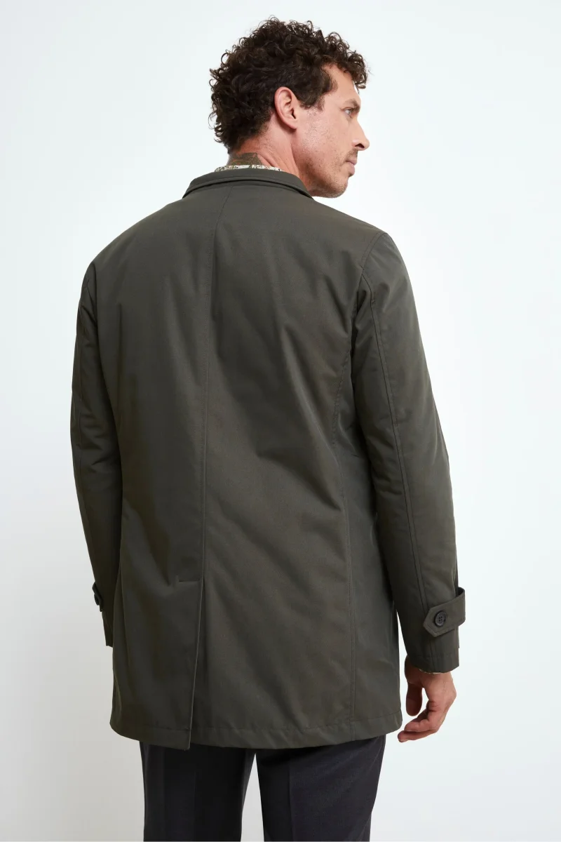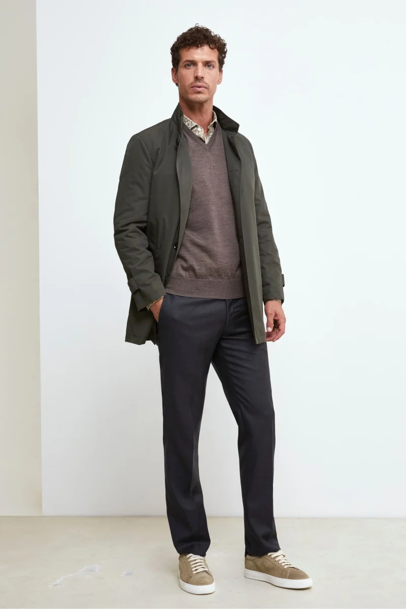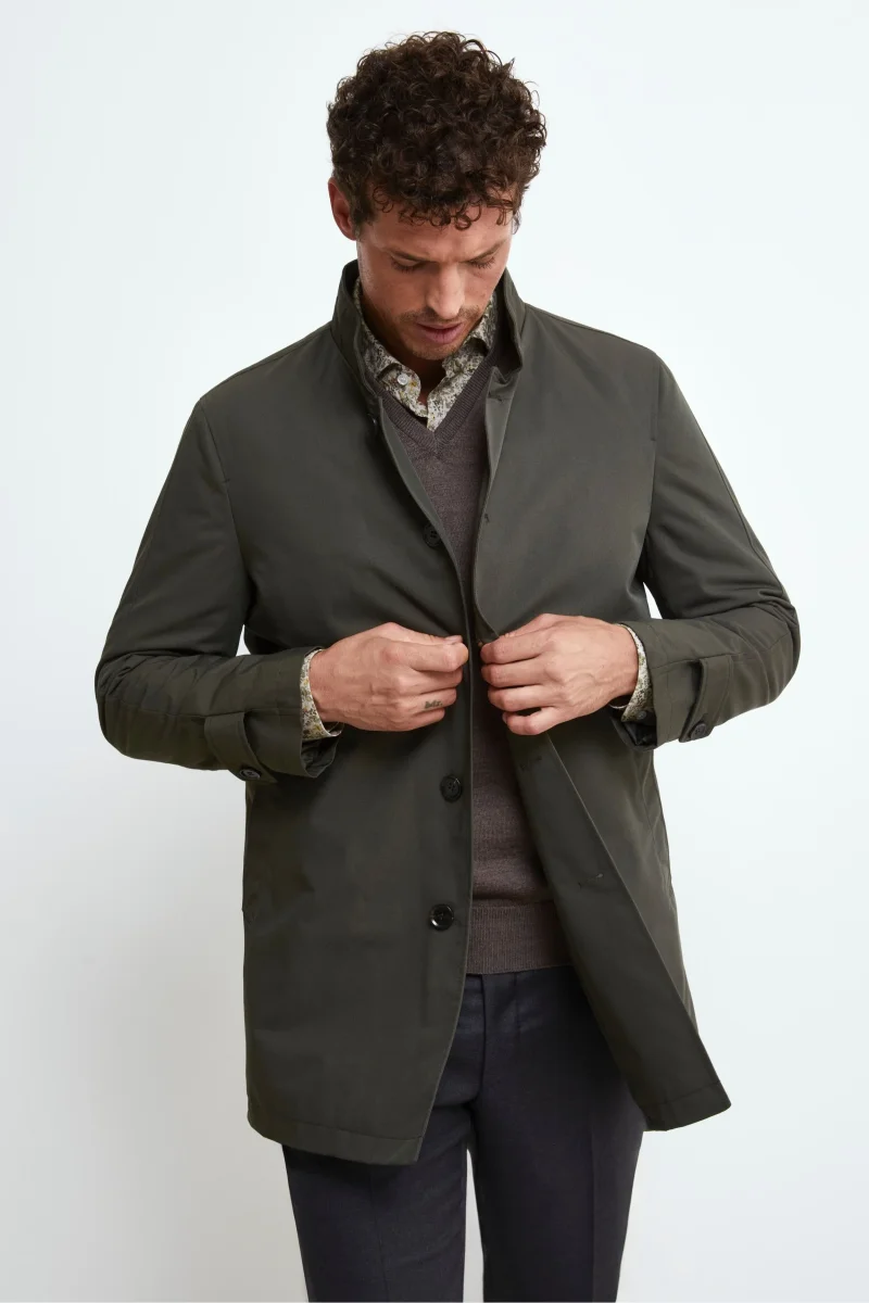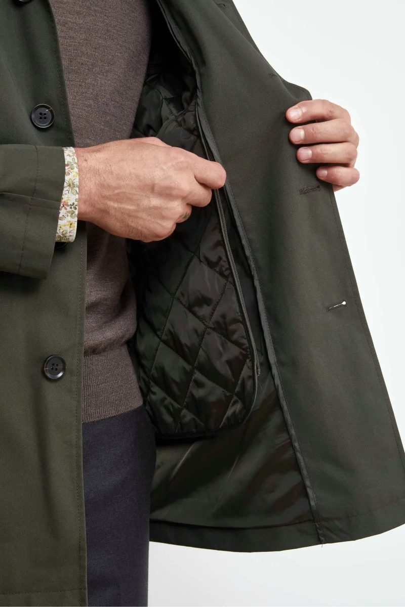 Impermeabile verde da uomo con gilet removibile: praticitร e stile per ogni stagione. Questo impermeabile monopetto da uomo รจ realizzato in tessuto tecnico idrorepellente, perfetto per affrontare le giornate imprevedibili con stile. Il gilet trapuntato interno removibile garantisce un comfort termico ideale nei mesi piรน freddi, rendendo il capo versatile e adatto a piรน stagioni. Il design classico รจ valorizzato dal rever tradizionale, dalla chiusura a cinque bottoni e dalle tasche a filo oblique laterali. Sul retro, lo spacco centrale con bottone a pressione assicura libertร di movimento e un tocco sartoriale. La vestibilitร regolare lo rende ideale da indossare con un dolcevita e pantaloni chino per un look casual-elegante, oppure sopra un abito per le occasioni piรน formali. Un must-have tra i giubbotti da uomo eleganti, perfetto per chi cerca un capo funzionale, curato e adatto a ogni contesto. Il modello รจ alto 189 cm e indossa la taglia 50.