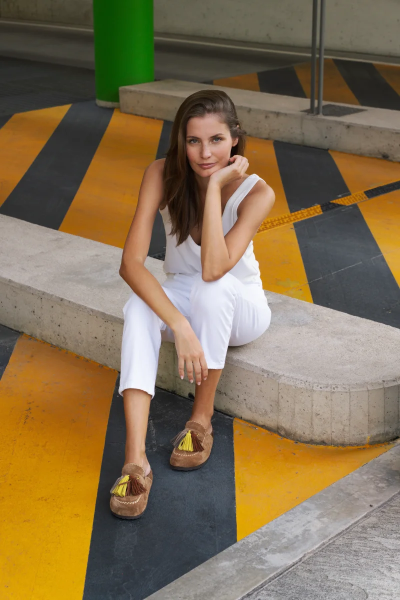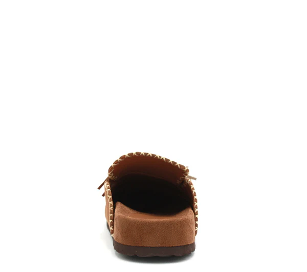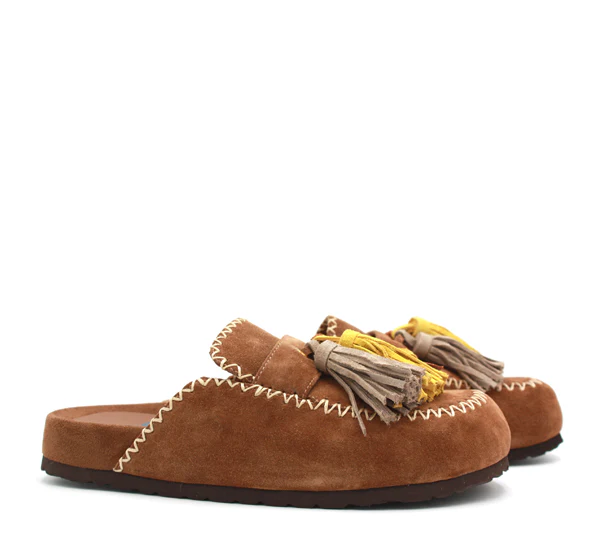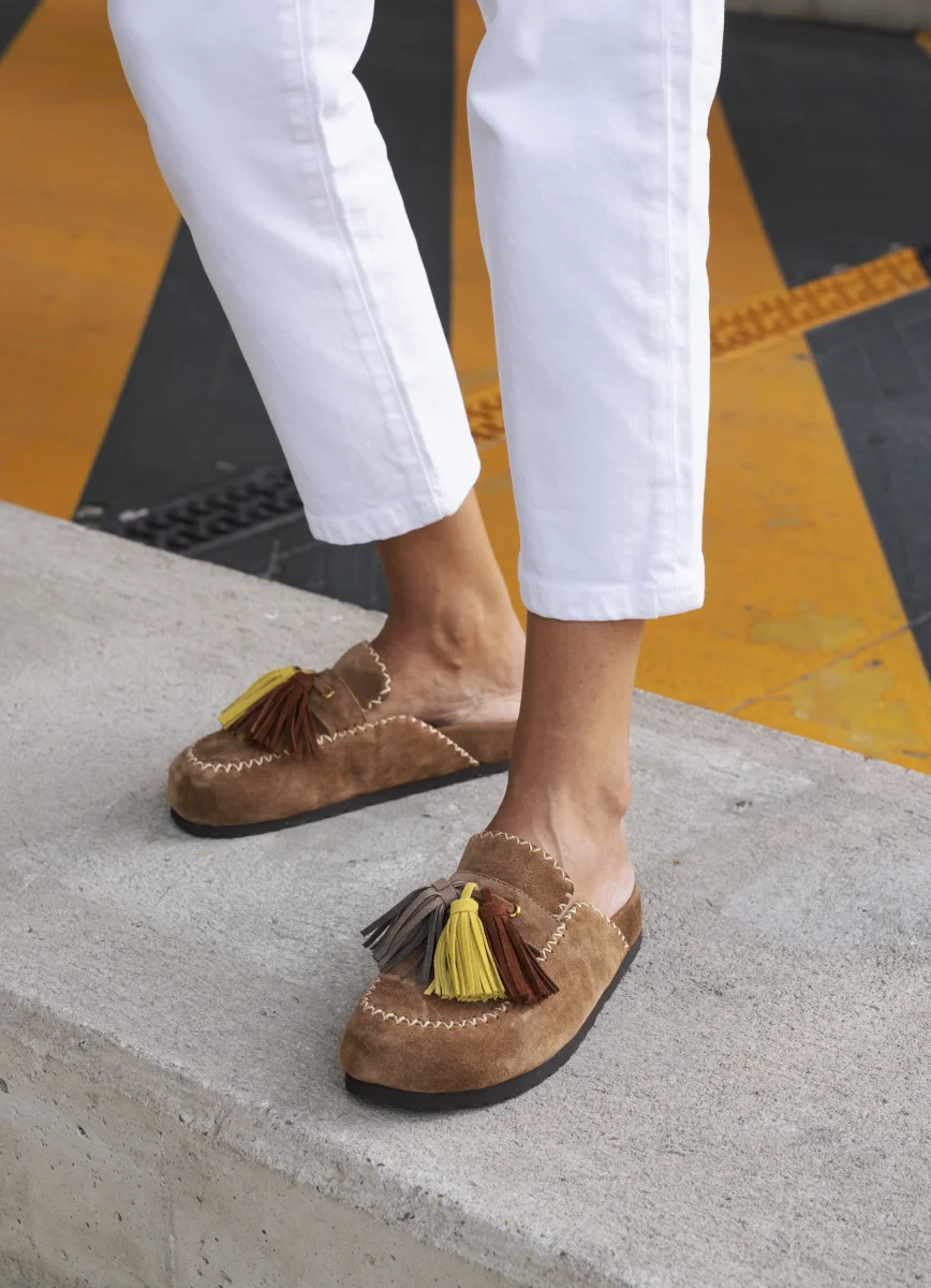 Una mule allegra e divertente. In camoscio color sigaro con nappine colorate.