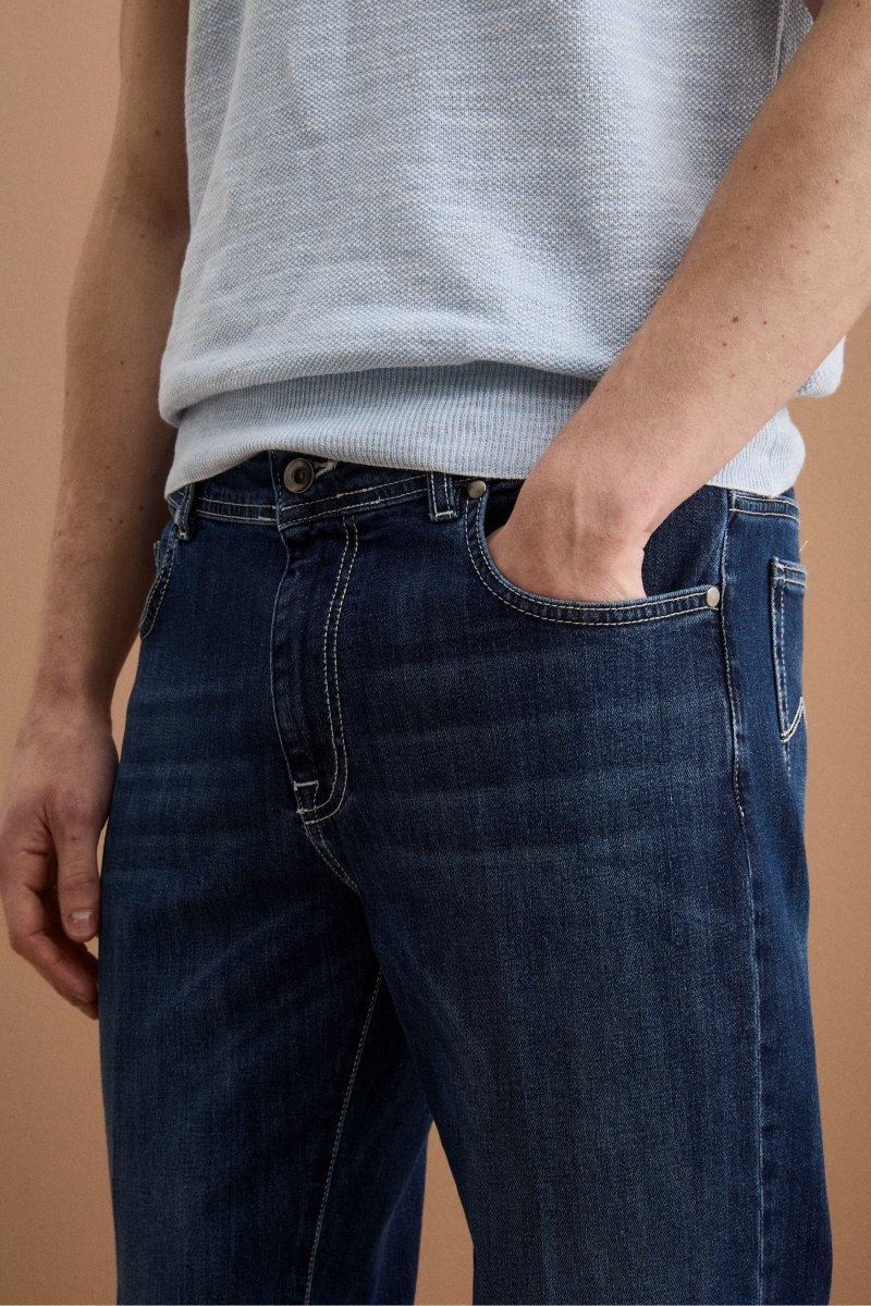 Jeans slim fit cinque tasche in denim stone wash da uomo, un capo essenziale dal carattere contemporaneo, perfetti per completare look casual con stile. Realizzati in cotone denim stone wash, si distinguono per la vestibilitร slim che valorizza la silhouette con una linea asciutta e moderna. Il design cinque tasche con passanti per cintura e chiusura frontale con bottone richiama lโiconica struttura del jeans, mentre il risvolto sul fondo aggiunge un dettaglio distintivo dal gusto attuale. Parte della collezione Il Lanificio e interamente Made in Italy, si abbinano con naturalezza a camicie in cotone o maglieria leggera per un outfit quotidiano curato, oppure a blazer e sneakers per uno stile urbano sofisticato. Il modello รจ alto 189 cm e indossa la taglia 50.
