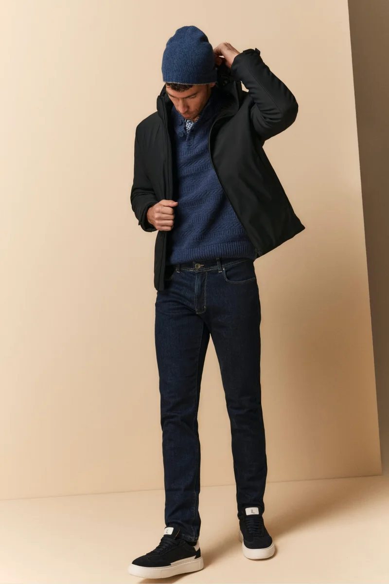 Perfetti per un look moderno e versatile, i jeans stretch slim fit da uomo uniscono stile e comfort grazie alla loro struttura in cotone stretch garzato. Questo tessuto di alta qualitร offre una sensazione morbida e piacevole al tatto, garantendo al tempo stesso elasticitร e resistenza. Caratterizzati da un design classico con cinque tasche, passanti per cintura e una chiusura frontale con bottone, questi jeans si distinguono per la loro vestibilitร slim fit, che valorizza la silhouette mantenendo il massimo comfort. Versatili e facili da abbinare, sono il capo perfetto per completare look casual o semi-formali. Il modello รจ alto 189 cm e indossa la taglia 48.