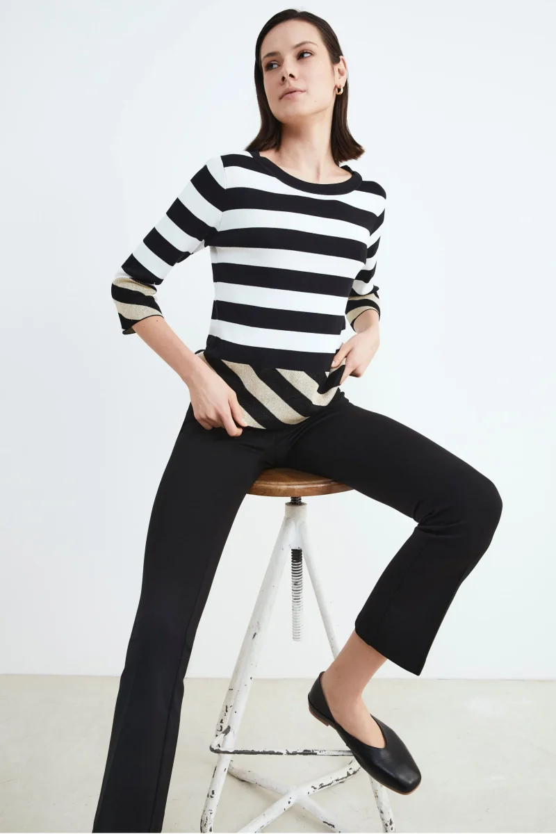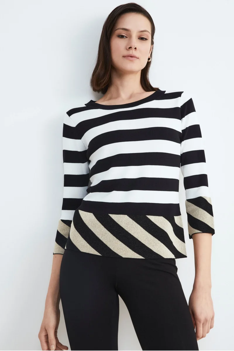 Maglia girocollo fantasia a righe in lurex da donna con manica 3/4. Con un design accattivante, questa maglia รจ perfetta per aggiungere un tocco di personalitร al tuo guardaroba. Indossala con un pantalone o jeans Il Lanificio per completare lโoutfit. Vestibilitร regolare. Made in Italy. La modella รจ alta 182 cm e indossa la taglia M.