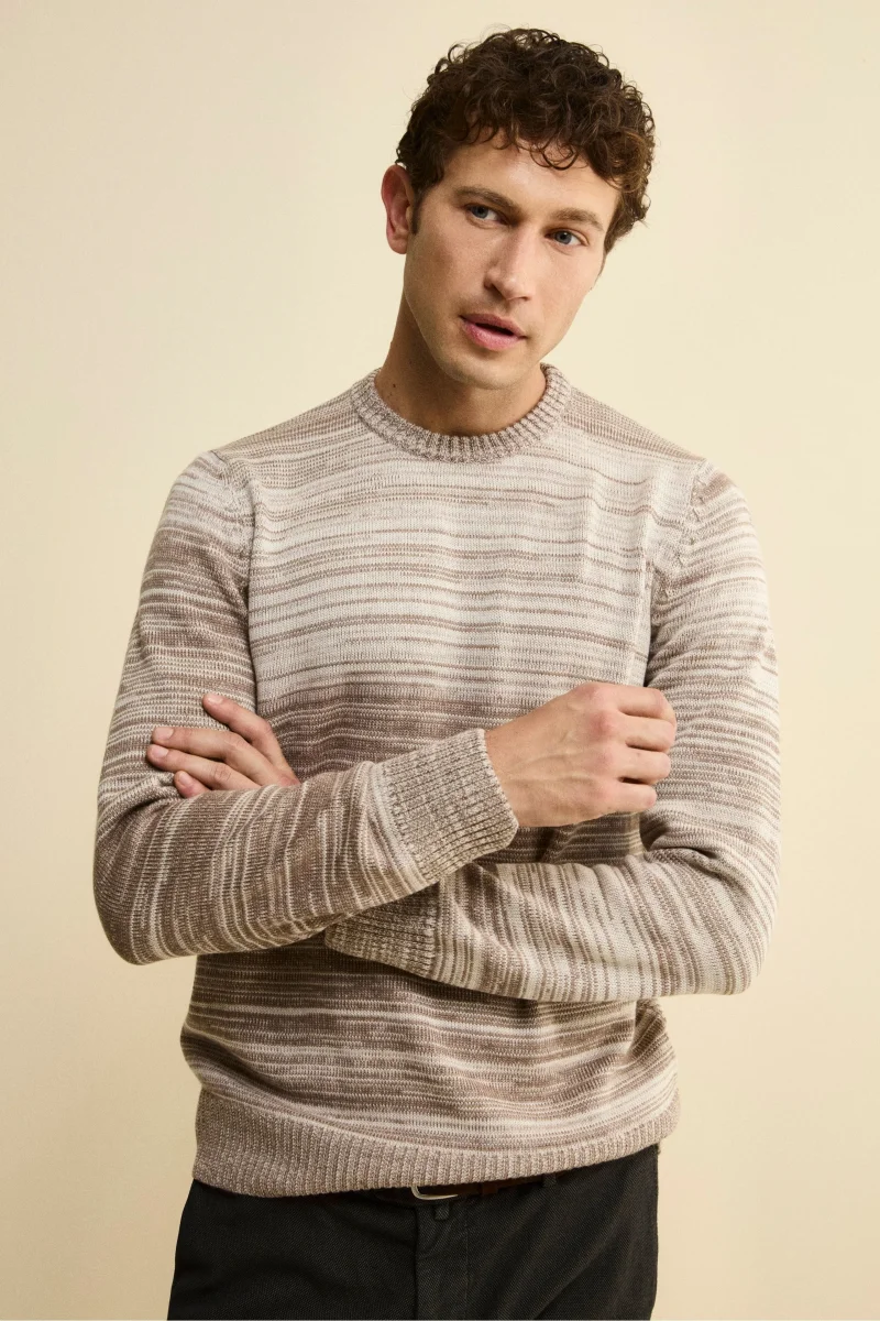 Maglia a Righe in Lana Merino, un capo essenziale del guardaroba invernale, realizzato in 100% lana merino con lavorazione a finezza 7, ideale per chi cerca maglie in lana merino da uomo calde, morbide e traspiranti. Il design girocollo con vestibilitร regolare e la fantasia a righe donano uno stile versatile e contemporaneo, perfetto per ogni occasione. Parte della collezione Il Lanificio e interamente Made in Italy, esprime qualitร , cura artigianale e attenzione ai dettagli. Perfetta da abbinare a pantaloni in lana, denim scuro o giacche casual per completare look di abbigliamento invernale da uomo eleganti e moderni. Il modello รจ alto 189 cm e indossa la taglia 50.