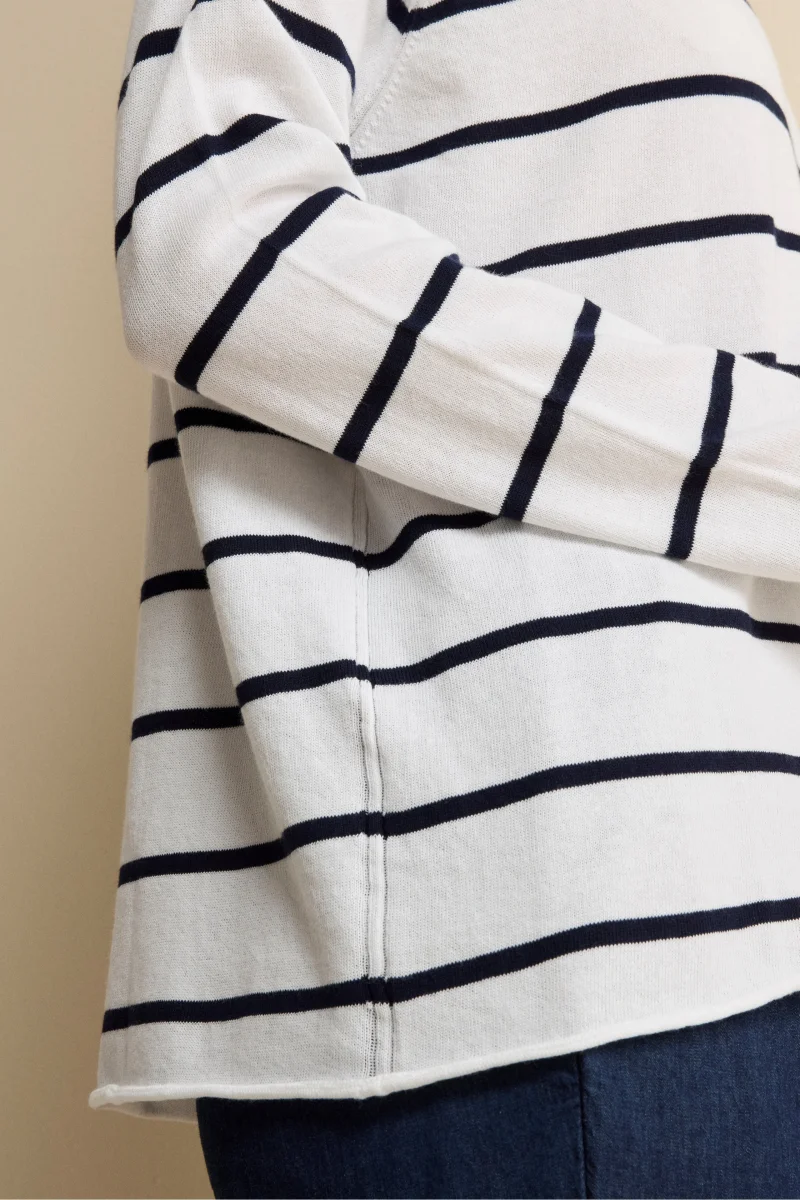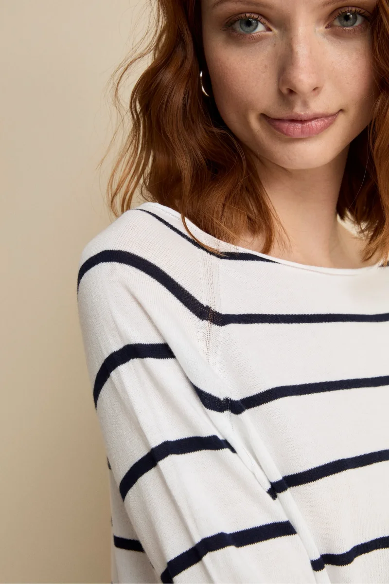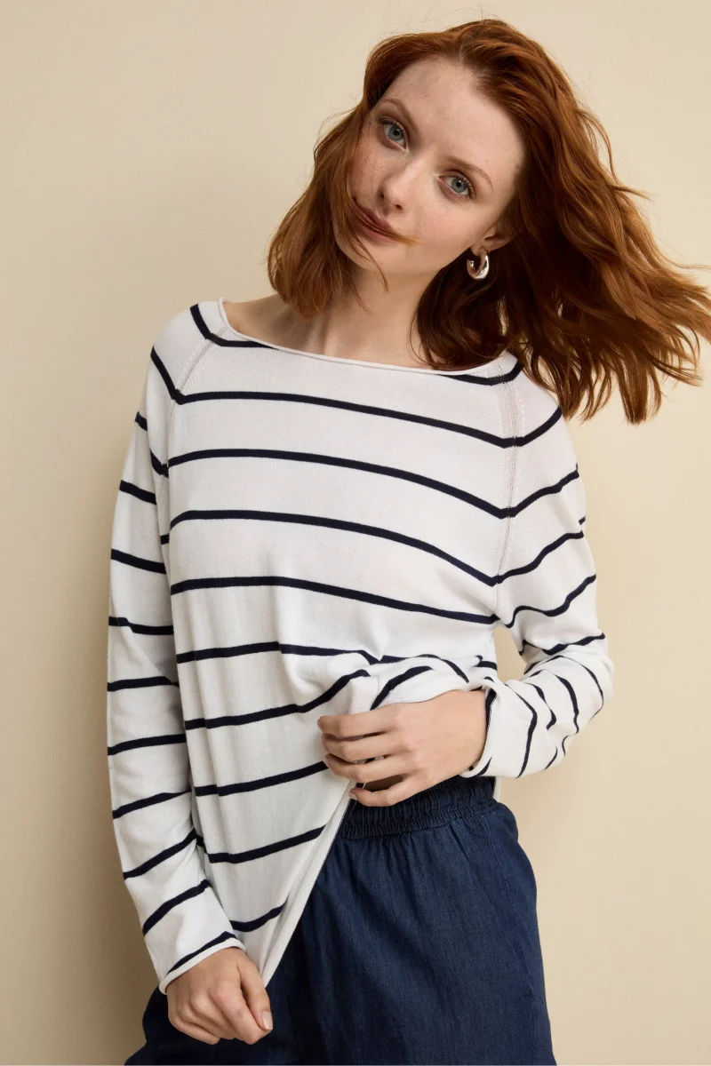 Realizzata in 100% cotone, questa maglia over da donna si distingue per la fantasia a righe orizzontali e la linea morbida. Lo scollo a barchetta e la manica raglan donano unโallure rilassata ma curata, mentre i bordi rifiniti a rollino aggiungono un tocco contemporaneo. Parte della collezione IL Lanificio, รจ un capo Made in Italy ideale da abbinare a pantaloni bianchi per un look fresco e primaverile, oppure a denim per un outfit casual dal gusto raffinato. La modella รจ alta 177 cm e indossa la taglia 42.