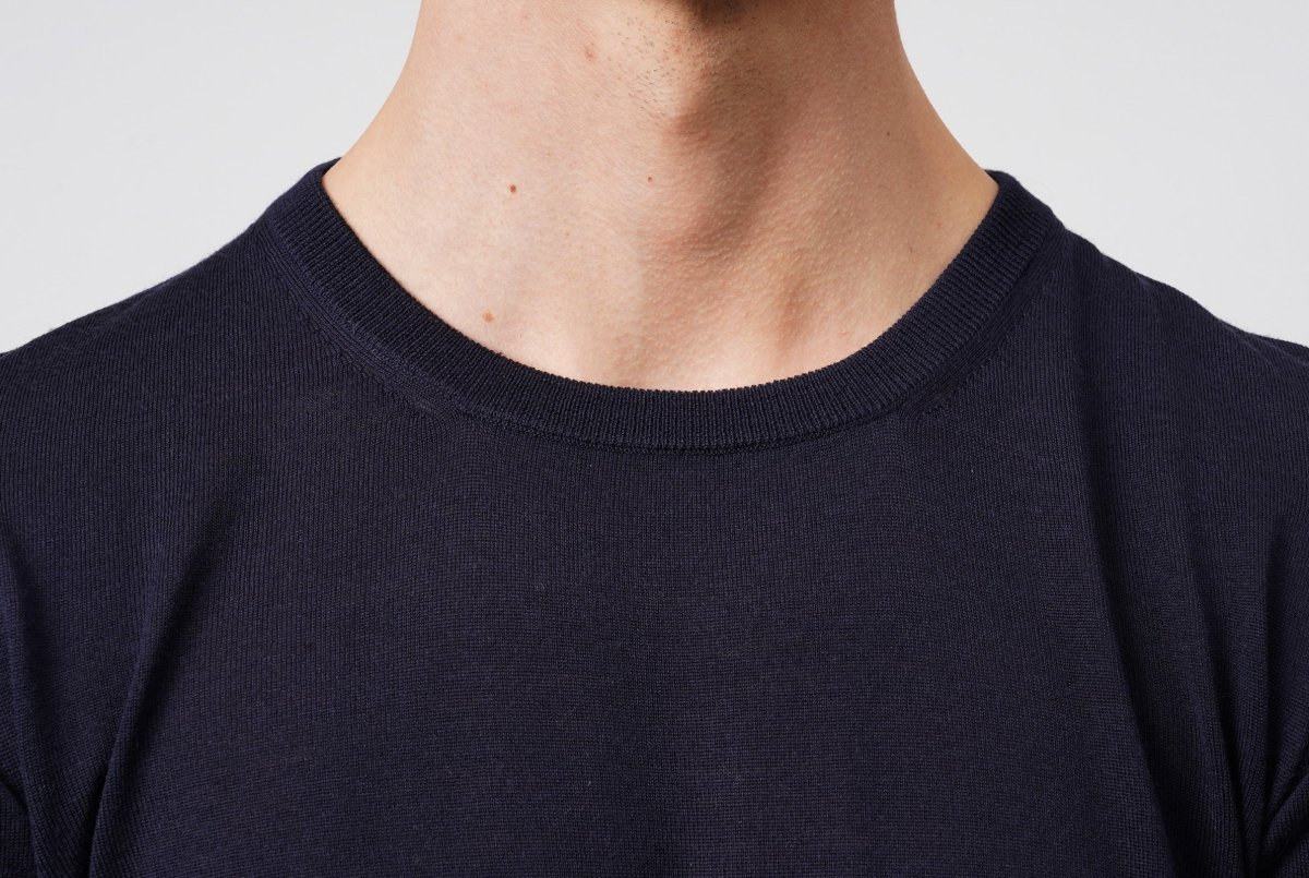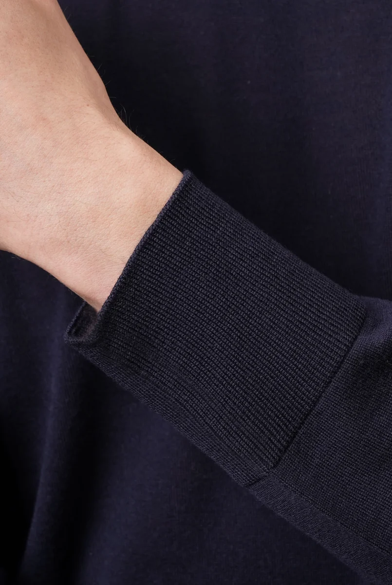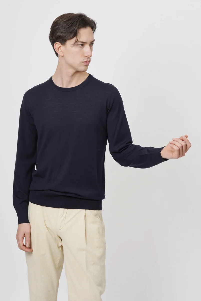 Maglia girocollo, manica lunga in Lana Merino super Fine finezza 12 Polso, collo e fondo in costina Dettagli: produzione: Made in Italy Finezza: 12 – Sotto Giacca Tessuto: Merino Extra Fine Vestibilitร : Slim Fit