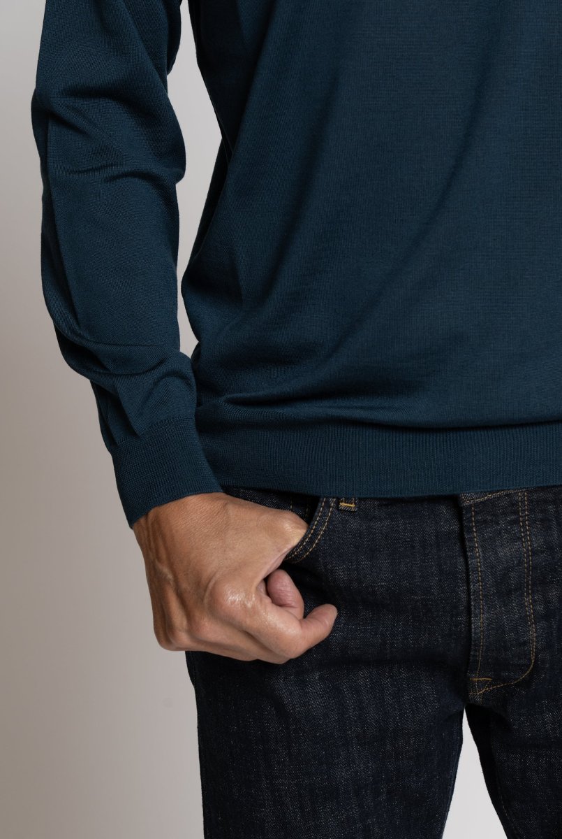 Maglia Giro Collo in Lana Royal Merino Extra Fine finezza 16. La sua Finezza permette di indossarla direttamente sulla pelle. Il modello รจ alto 185 cm e veste una taglia M Dettagli: Finezza 16 – Sotto Giacca 100% Lana Merino Zegna Baruffa extra fine Made in Italy Costina Collo, Fondo Manica, Fondo Maglia