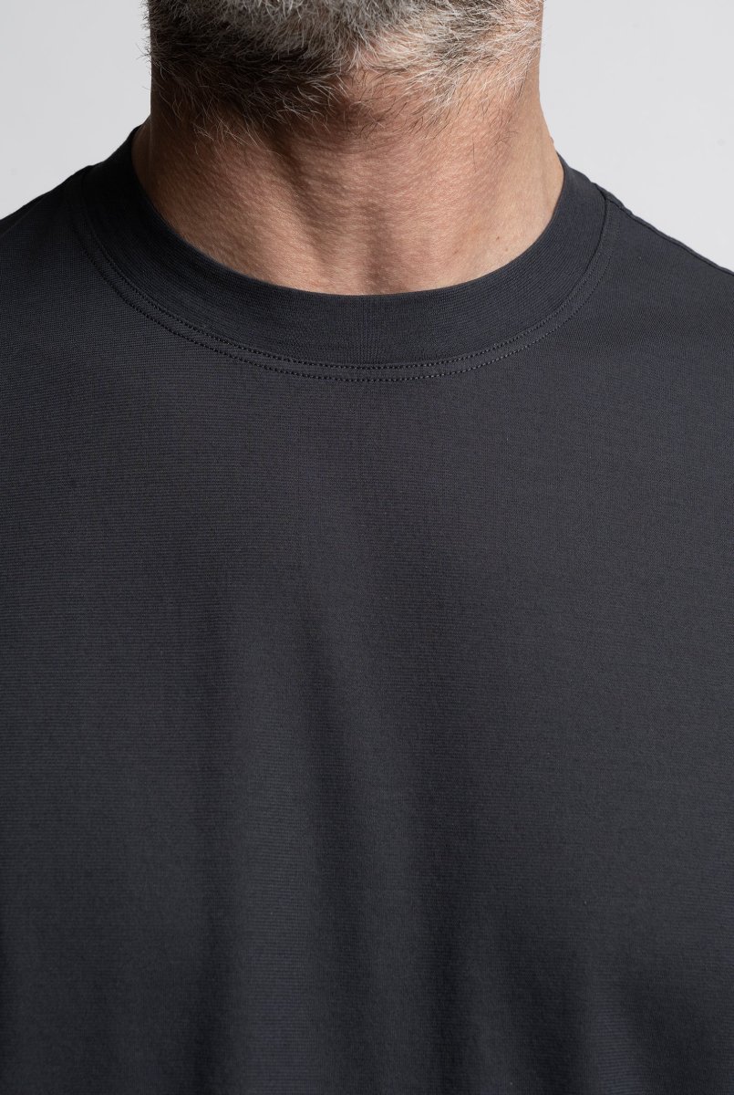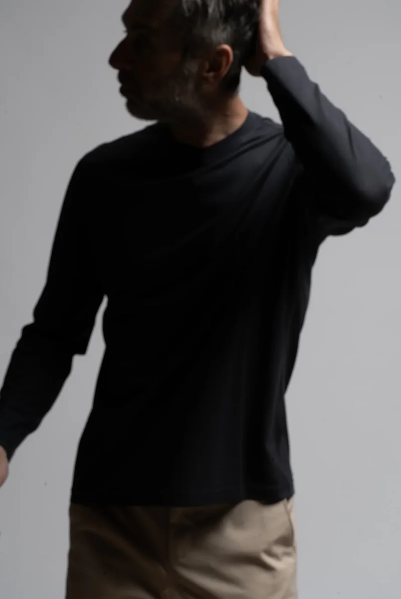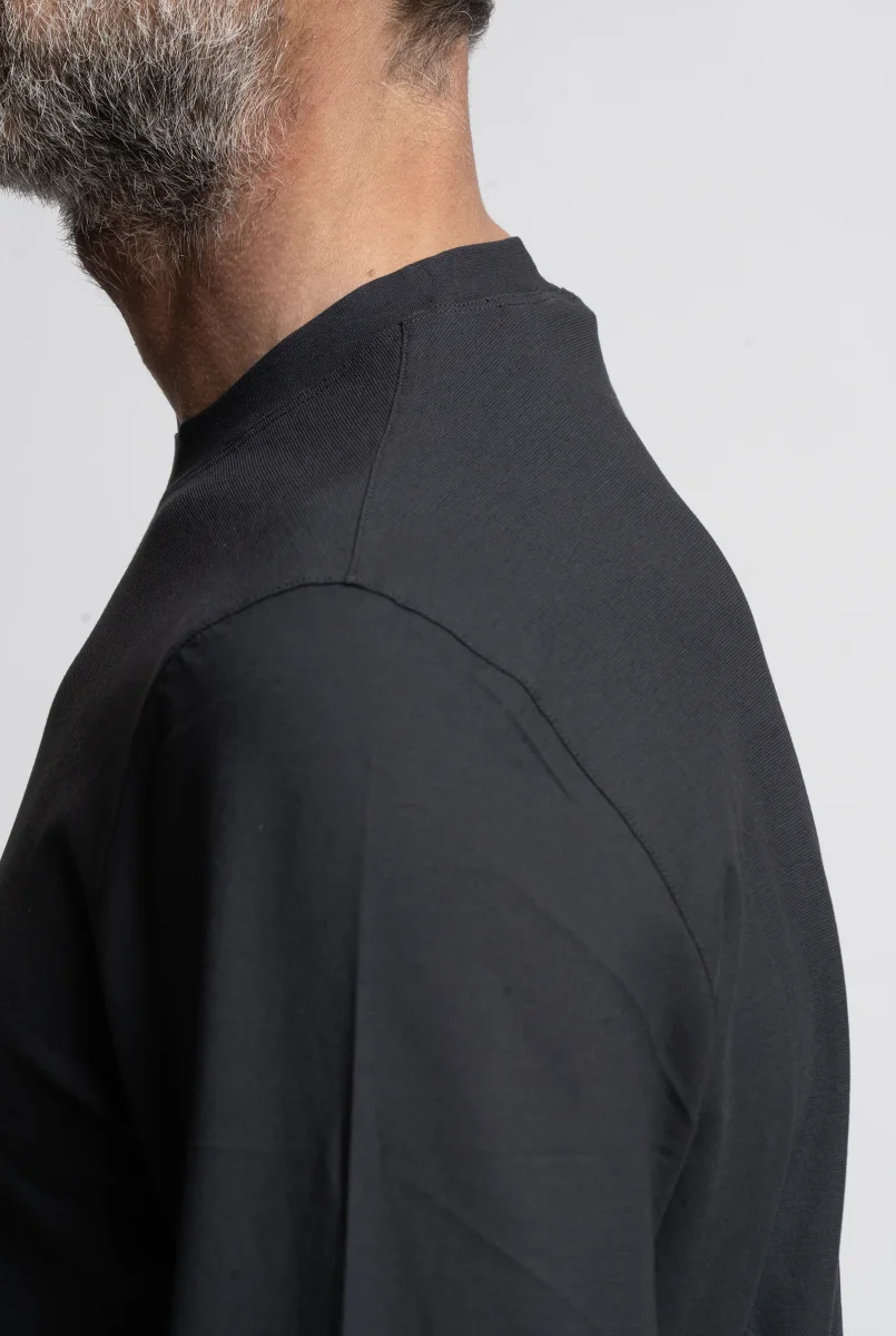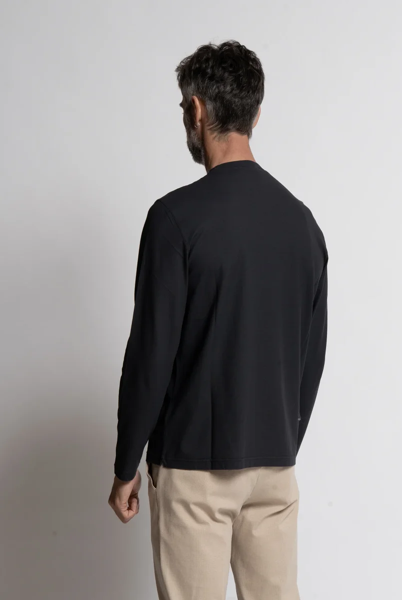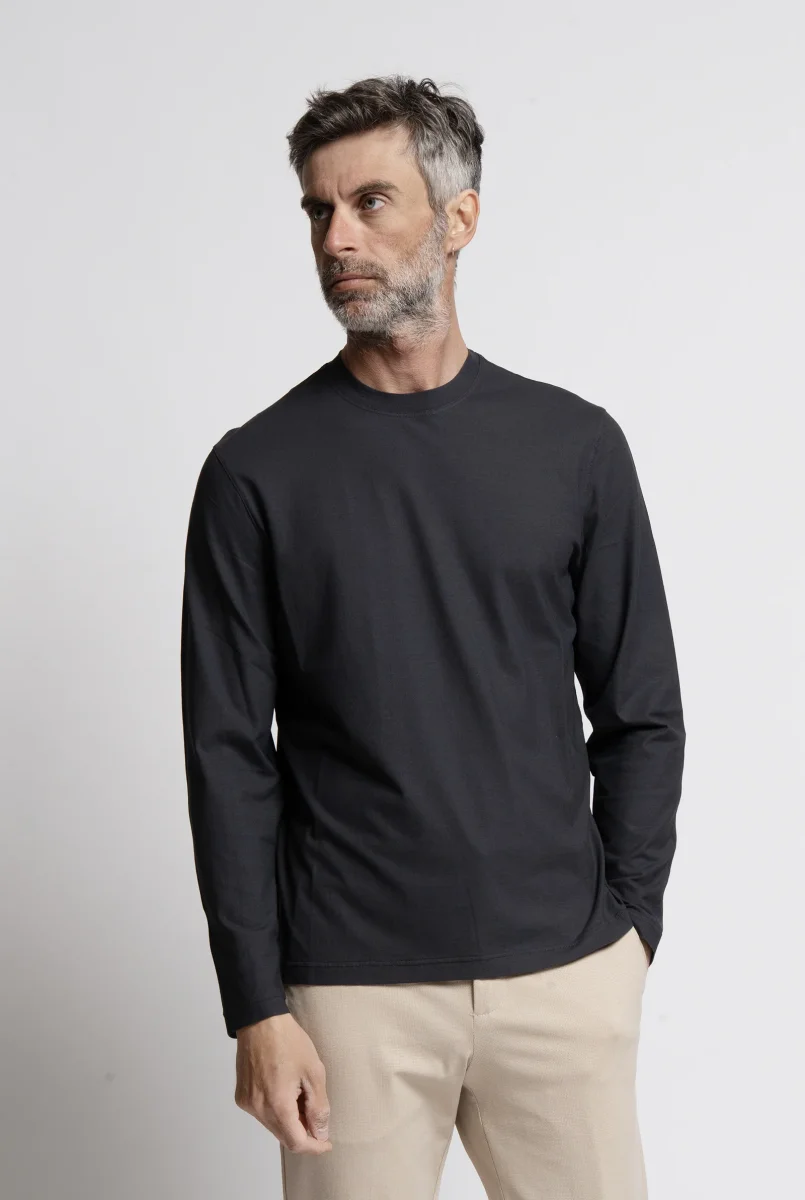 Essenziale e raffinata, questa maglia leggera a manica lunga è realizzata in crêpe di cotone color grigio fumo, ideale per un comfort fresco e naturale. Il collo con finitura a costina aggiunge un tocco di carattere al design minimalista.