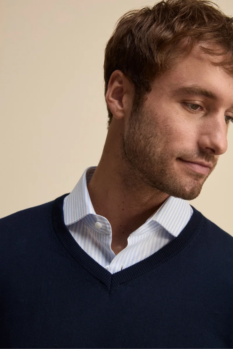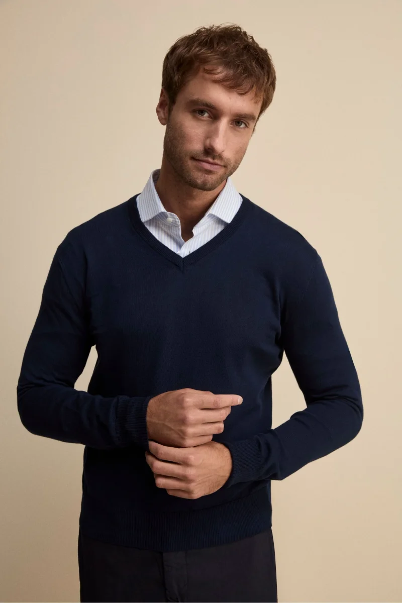 Maglia scollo a V in cotone con Bordi Lavorati – BLU
