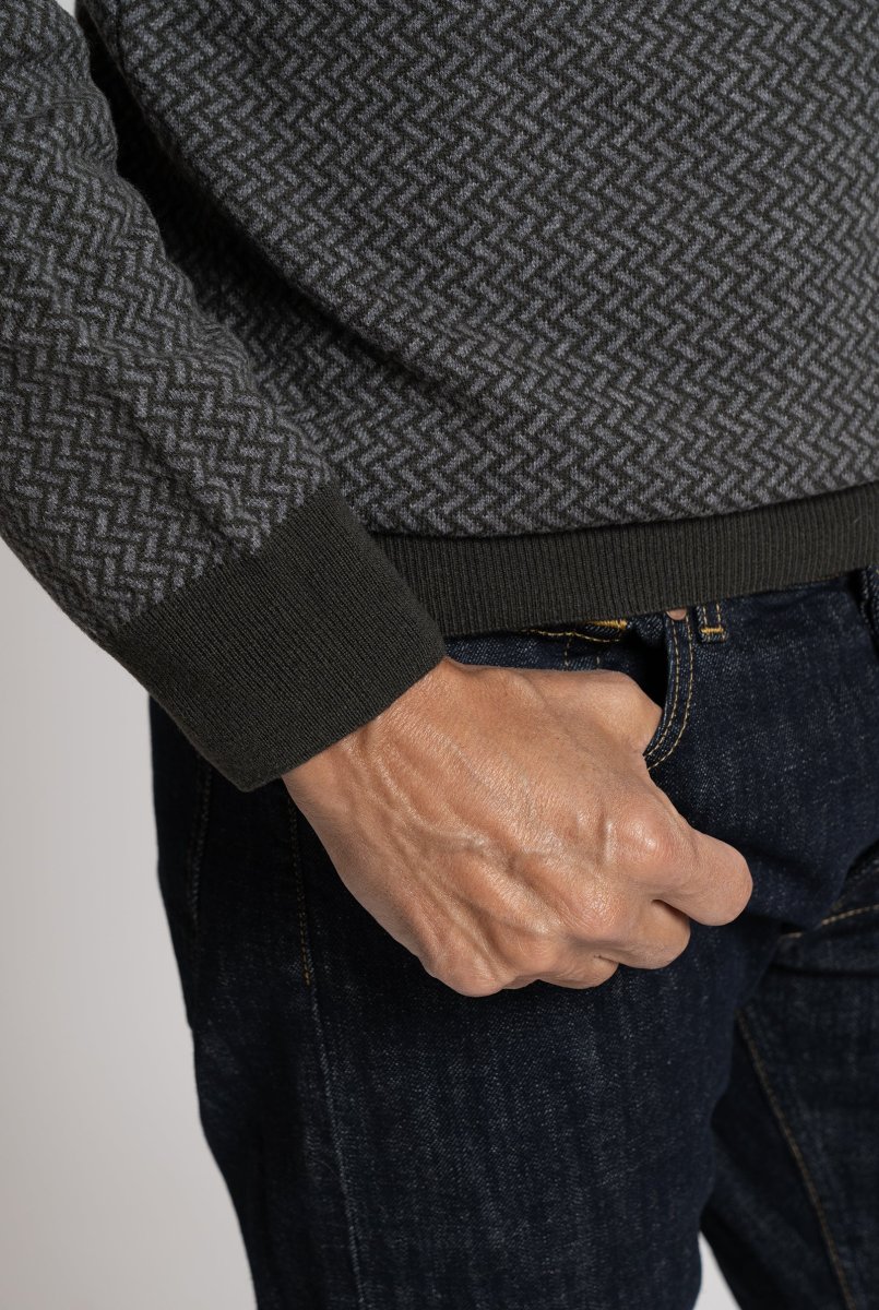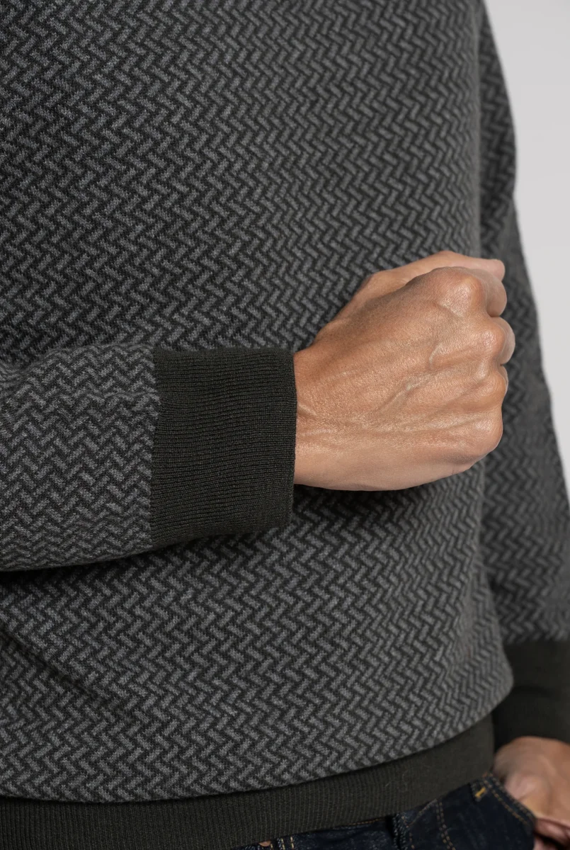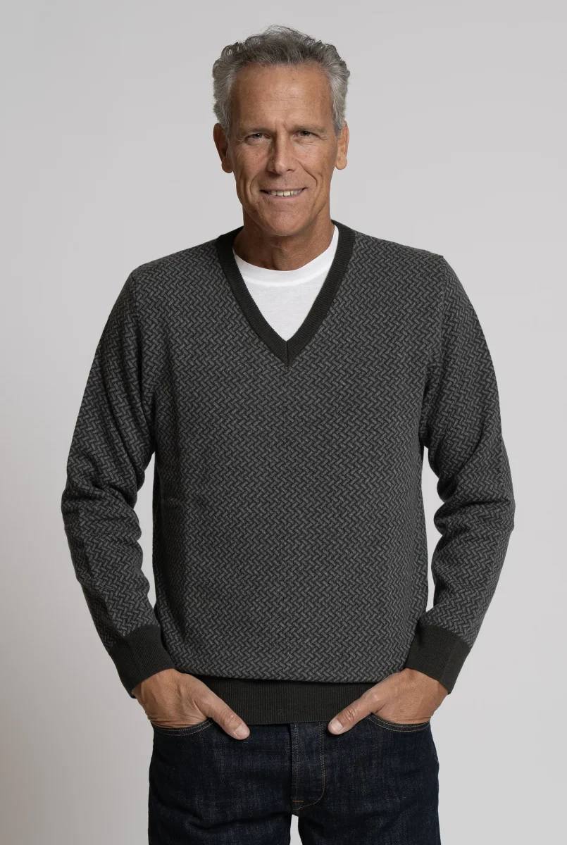 Maglia realizzata in pura lana merino extrafine, impreziosita da una lavorazione micrografica geometrica nei toni del marrone e taupe. Il design con scollo a V e costina in contrasto color navy dona al capo un carattere raffinato e contemporaneo.