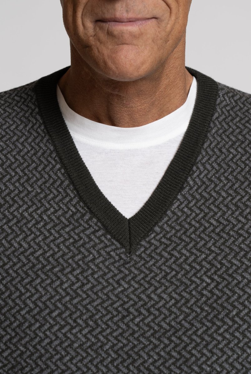 Maglia Scollo a V in Lana Merino Micrografica Geometrica, Marrone e Taupe