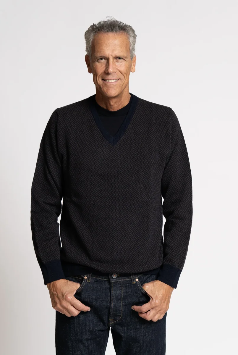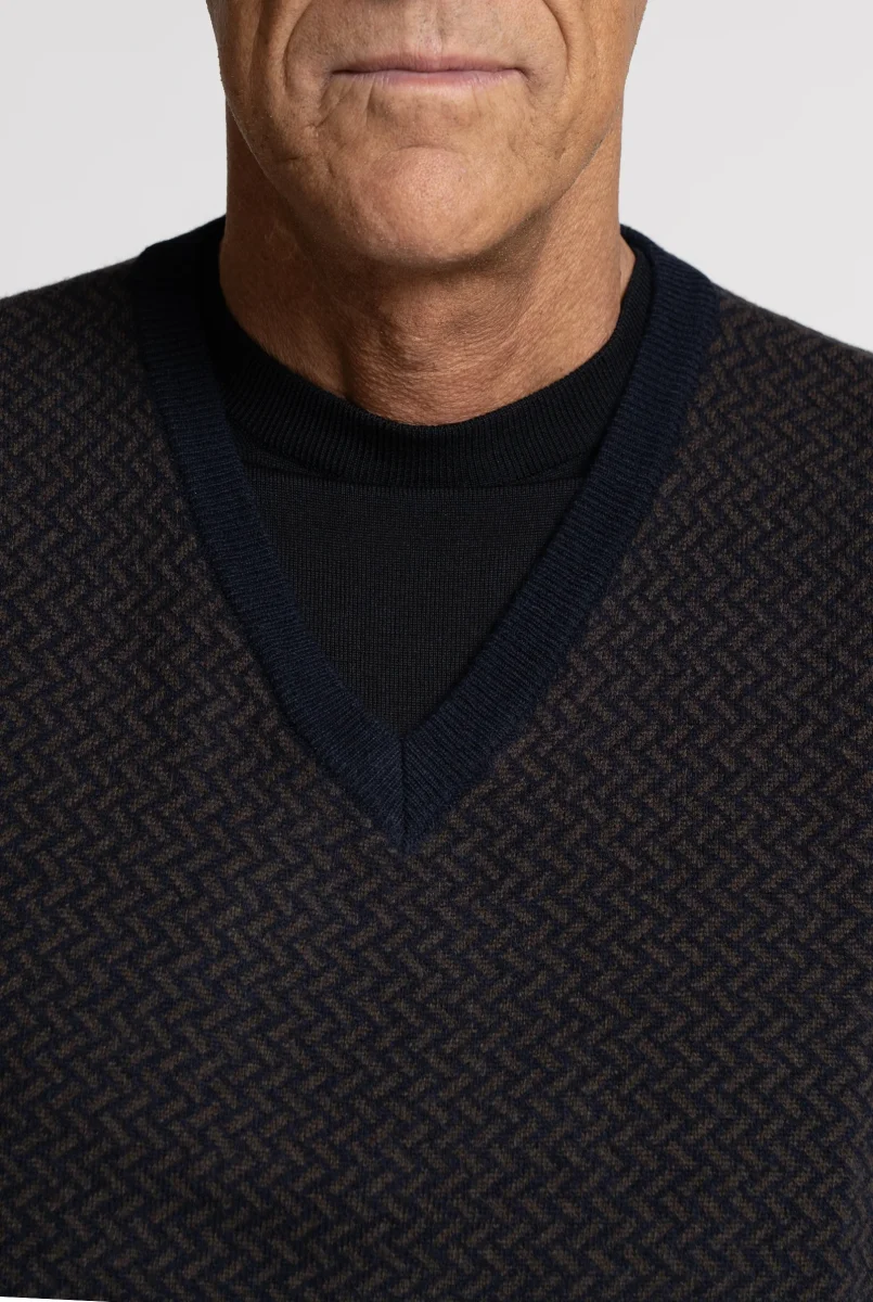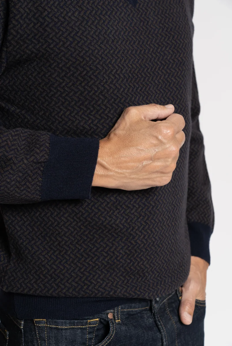 Maglia realizzata in pura lana merino extrafine, impreziosita da una lavorazione micrografica geometrica nei toni del Navy e Marrone. Il design con scollo a V e costina in contrasto color navy dona al capo un carattere raffinato e contemporaneo.