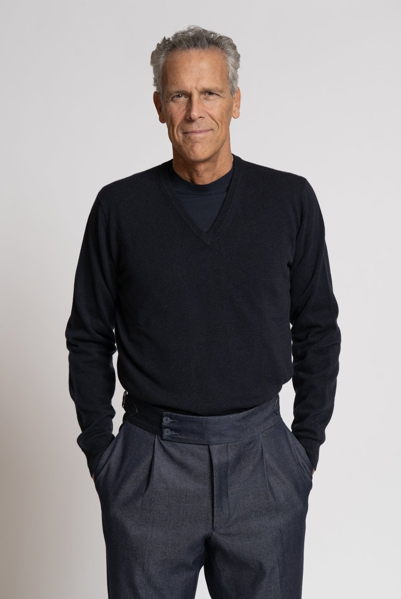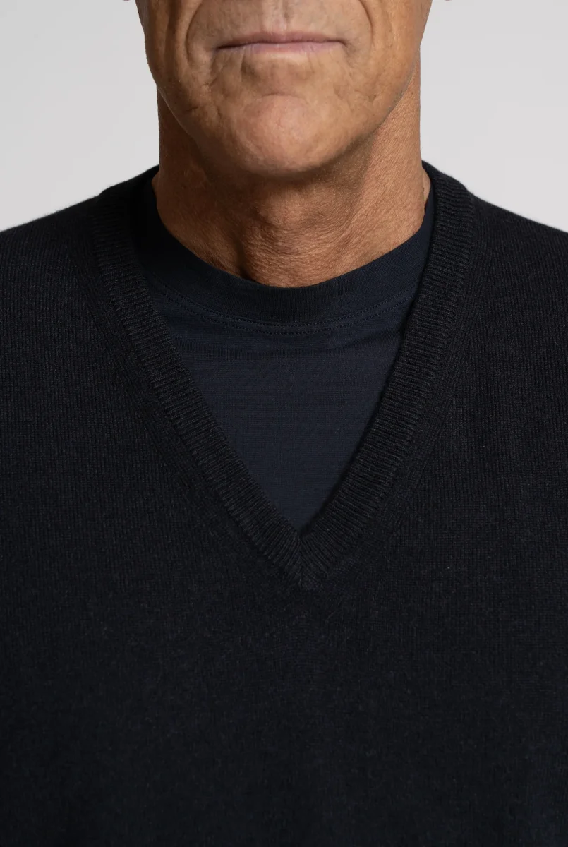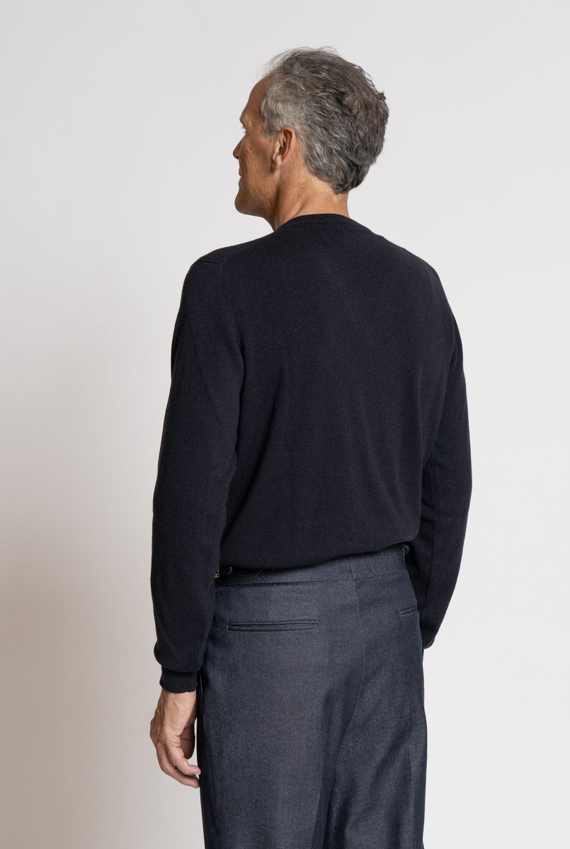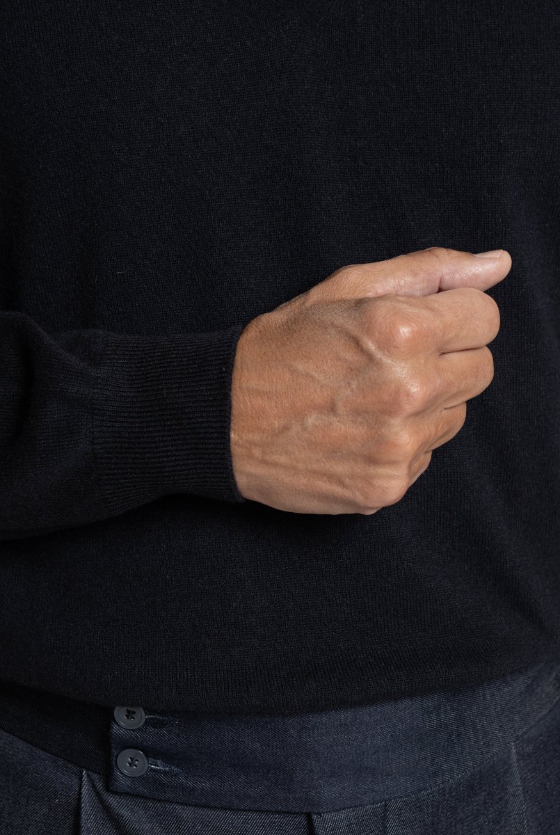 Pregiata maglia con scollo a V realizzata in puro cashmere, simbolo di eleganza senza tempo e comfort assoluto. Il colore navy valorizza la morbidezza e la naturale lucentezza del filato, donando al capo un aspetto raffinato e versatile, ideale sia per look casual che piรน formali.
