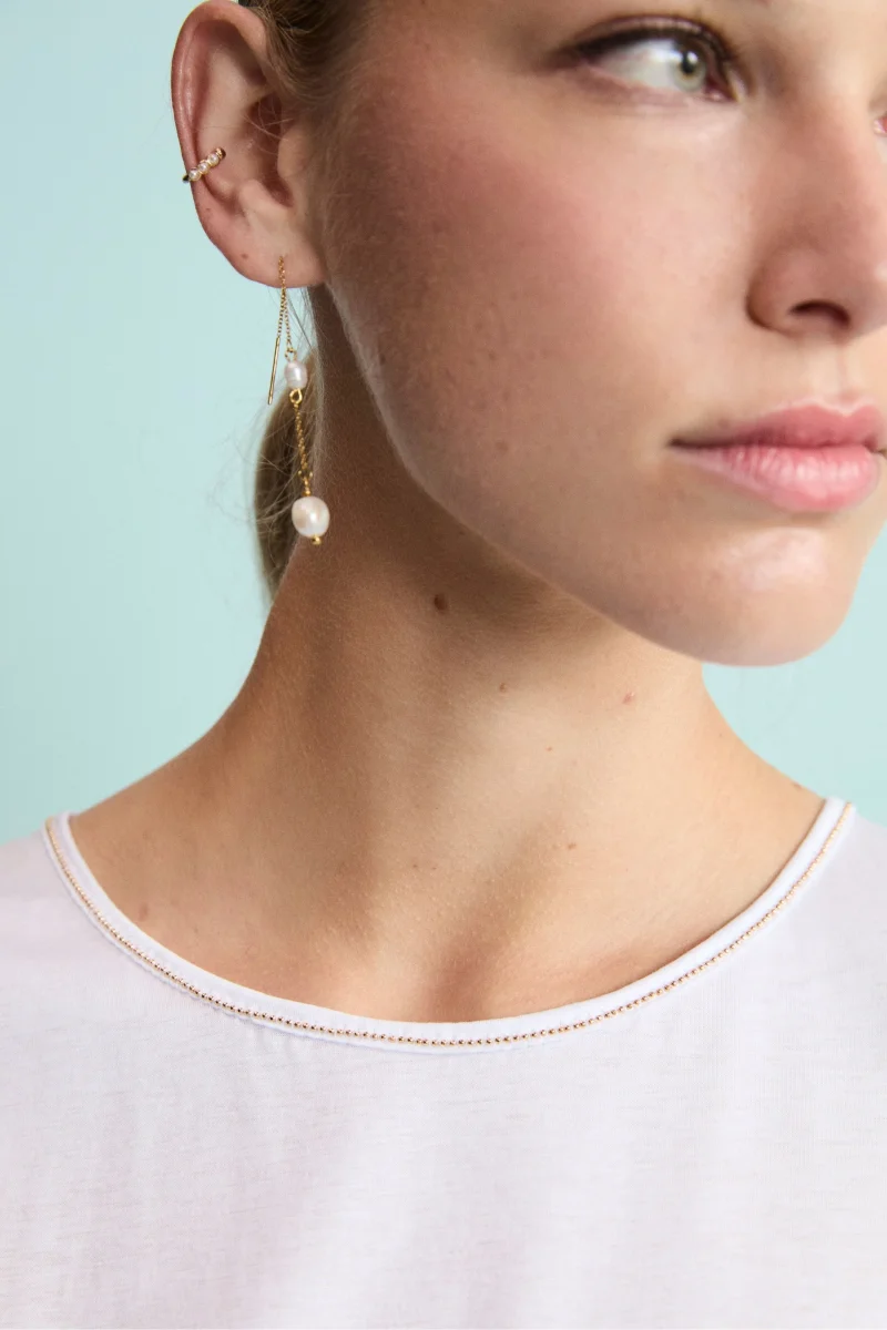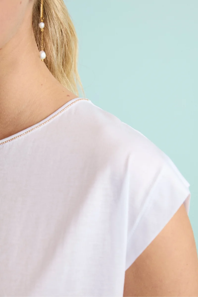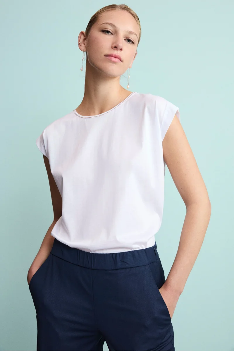 Maglietta Girocollo in Jersey di Cotone: eleganza essenziale per occasioni speciali. Questa raffinata t-shirt da donna รจ realizzata in jersey di cotone modal, un tessuto noto per la sua morbidezza, traspirabilitร e naturale elasticitร . Leggera e piacevole al tatto, garantisce una vestibilitร confortevole e un look sempre impeccabile. Il design elegante con girocollo rifinito da un bordo a contrasto e maniche ad aletta dona un tocco di stile senza tempo, mentre la vestibilitร regolare la rende adatta a diverse fisicitร . Ideale per occasioni formali e cerimonie, questa maglietta elegante da donna รจ perfetta da indossare sotto tailleur e giacche IL Lanificio per creare outfit ricercati e armoniosi. Made in Italy. La modella รจ alta 175 cm e indossa la taglia 42.