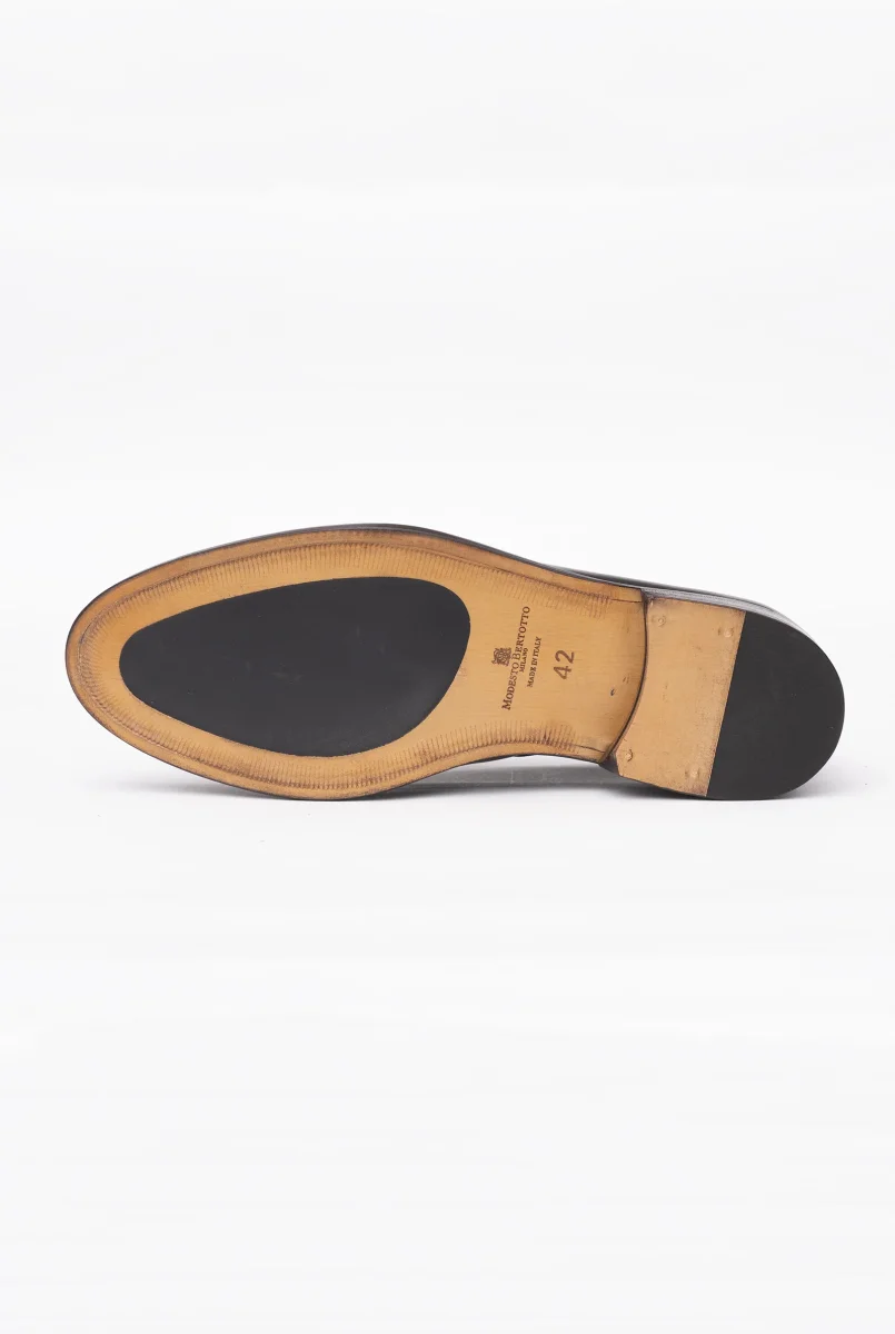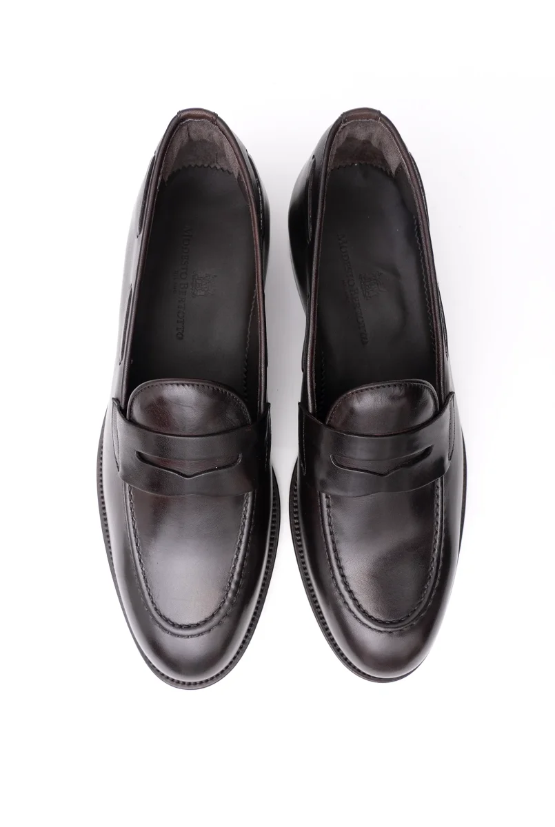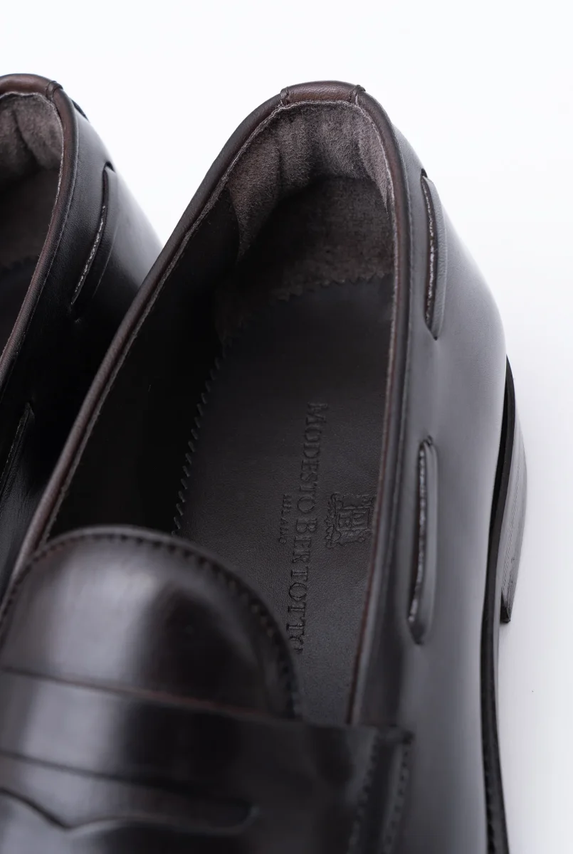 Le Scarpe Mocassino di Modesto Bertotto sono progettate e realizzate interamente a mano da artigiani in Italia. La pelle di vitello spazzolato viene trattata per diventare idrorepellente e antigraffio. La soletta interna permette un comfort elevato che rende il prodotto adatto ad un utilizzo prolungato senza affaticare il piede durante la giornata.