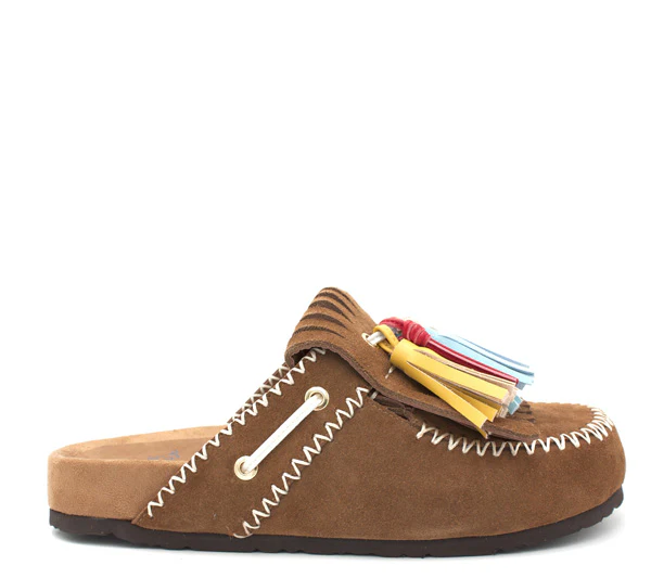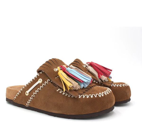 Una mule allegra e divertente. In camoscio color cuoio con nappine colorate.