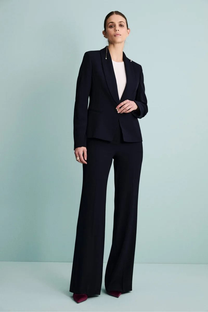 Pantalone a palazzo con fusciacca da donna, realizzato in twill leggero, รจ la scelta perfetta per un look sofisticato e contemporaneo. Caratterizzato da una vestibilitร regolare e una gamba ampia e fluida, dona slancio alla figura e un tocco di raffinatezza senza tempo. La fusciacca in vita, insieme ai passanti per cintura, valorizza il punto vita e aggiunge un dettaglio chic e raffinato. Il design a palazzo lo rende ideale per cerimonie ed eventi speciali. Perfetto da abbinare al bolero coordinato per creare un tailleur elegante e moderno, รจ un capo esclusivo della collezione IL Lanificio, interamente Made in Italy. Un must-have per chi ama vestire con stile e leggerezza. La modella รจ alta 177 cm e indossa la taglia 40.