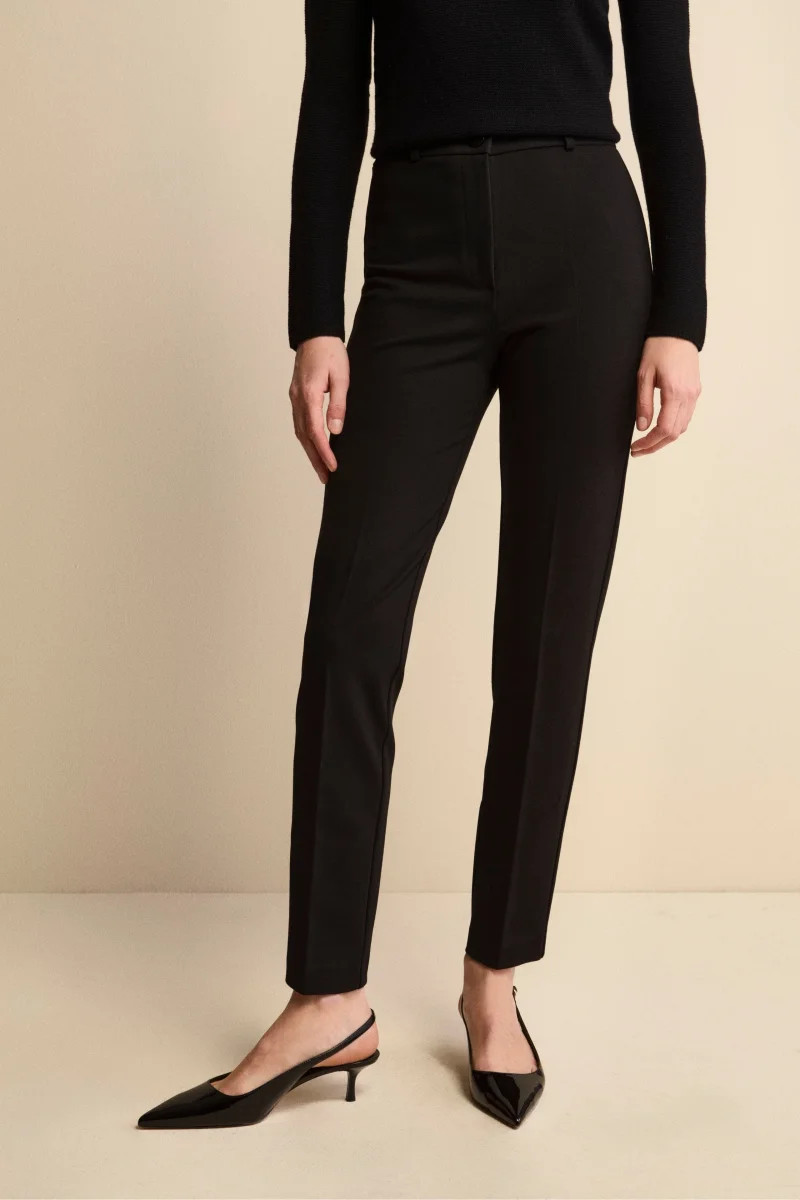 Pantalone da donna a sigaretta in morbido tessuto in misto viscosa con chiusura a un bottone, cerniera nascosta e passanti per cintura. Da utilizzare con look casual o informale. Vestibilitร asciutta e lunghezza alla caviglia. Disponibile in piรน colori. Made in Italy. La modella รจ alta 178 e indossa la taglia 42.