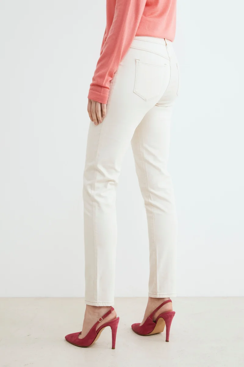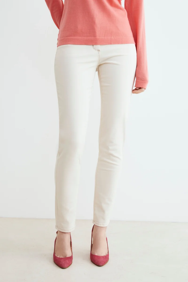 Pantalone bianco 5 tasche in cotone con chiusura 1 bottone e passanti per cintura. Realizzati con tessuti di alta qualitร , questi pantaloni offrono comfort e versatilitร ineguagliabili. Il loro colore luminoso aggiunge un tocco di raffinatezza e stile a qualsiasi outfit. Perfetti per le giornate di sole e le serate estive, sono ideali da abbinare a una camicia leggera per un look casual chic o a una blusa elegante per unโoccasione piรน formale. Vestibilitร slim. La modella รจ alta 174 cm e indossa la taglia 40.