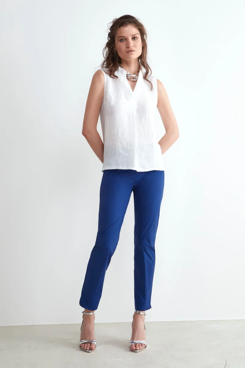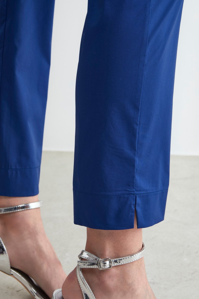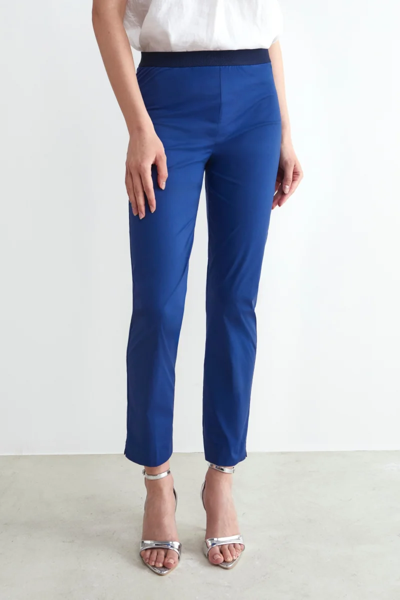 Pantalone lungo da donna modello capri in cotone elasticizzato con elastico in vita, fondo con spacchetti. Ideale per ogni occasione. Completa il look con un top o t-shirt Il Lanificio. Made in Italy. La modella รจ alta 177 cm e indossa la taglia 42.
