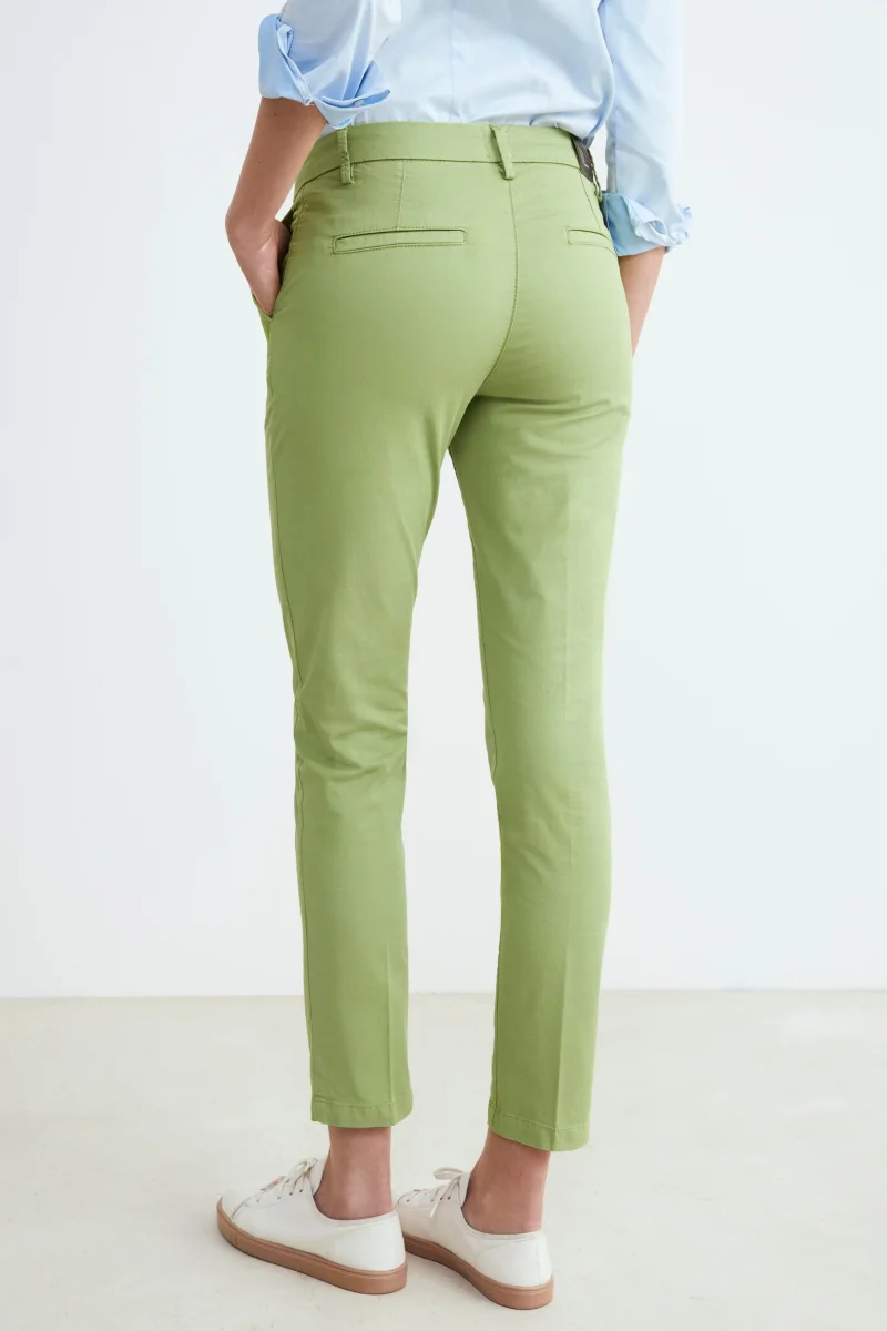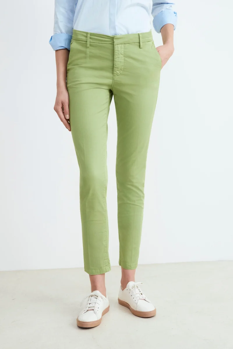 Pantaloni da donna in morbido cotone modello chino, realizzato con pratiche tasche sul fronte e sul retro, chiusura con zip e bottone. Pantalone sportivo e comodo, leggermente elasticizzato, adatto agli outfit piรน casual in ufficio e nel tempo libero. Vestibilitร slim fit e vita bassa. Made in Italy. La modella รจ alta 179cm e indossa una taglia 42