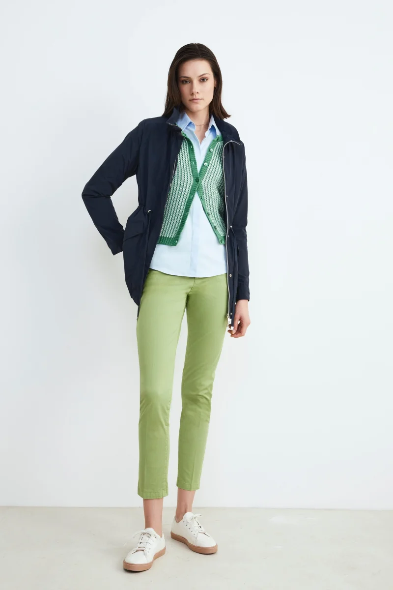 Pantaloni da donna in morbido cotone modello chino, realizzato con pratiche tasche sul fronte e sul retro, chiusura con zip e bottone. Pantalone sportivo e comodo, leggermente elasticizzato, adatto agli outfit piรน casual in ufficio e nel tempo libero. Vestibilitร slim fit e vita bassa. Made in Italy. La modella รจ alta 179cm e indossa […]