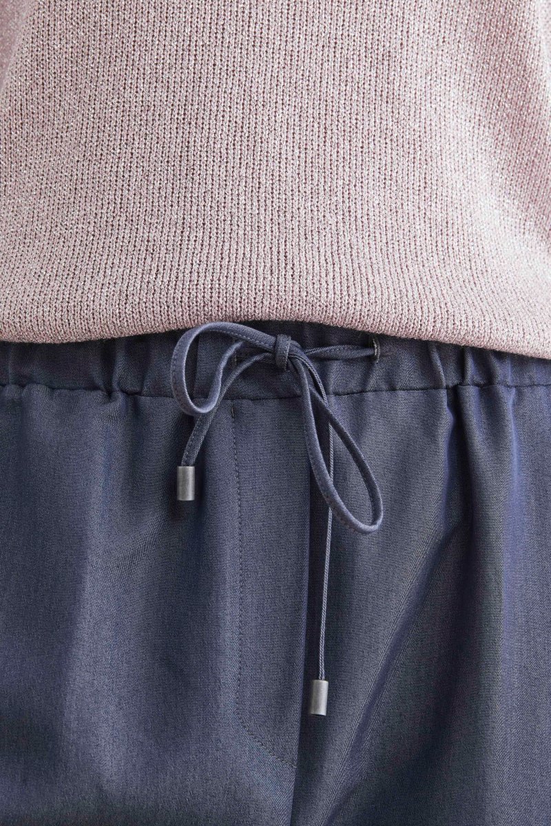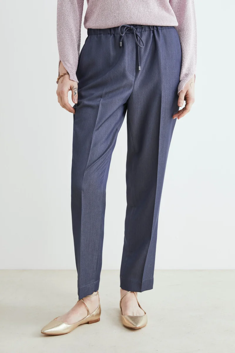Pantaloni coulisse donna con elastico in vita, chiusura con laccio frontale e tasche laterali. Progettati per offrire comfort e versatilitร senza sacrificare lo stile, questi pantaloni sono la scelta perfetta per chi cerca un look rilassato ma alla moda. Completa il look con il pullover in cotone Il Lanificio. Vestibilitร comoda e made in Italy. La modella รจ alta 182 cm e indossa la taglia 42.