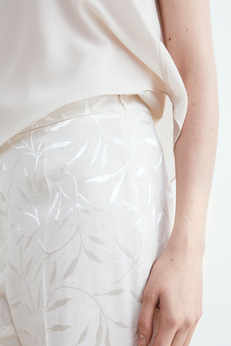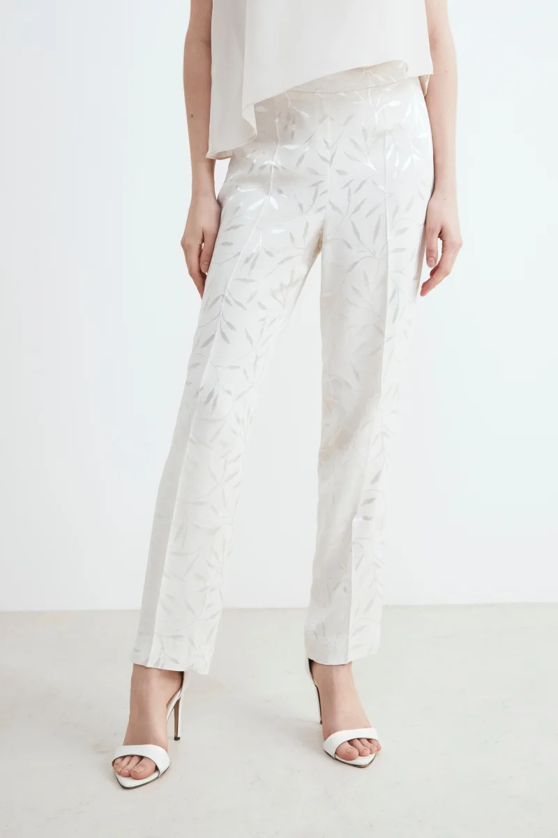 Pantalone bianco elegante damascato da donna a sigaretta. Perfetto per le occasioni eleganti, in abbinamento con il blazer della stessa fantasia ti farร distinguere con stile ovunque tu vada. Vestibilitร regolare. Made in Italy. La modella รจ alta 175 cm e indossa la taglia 40.