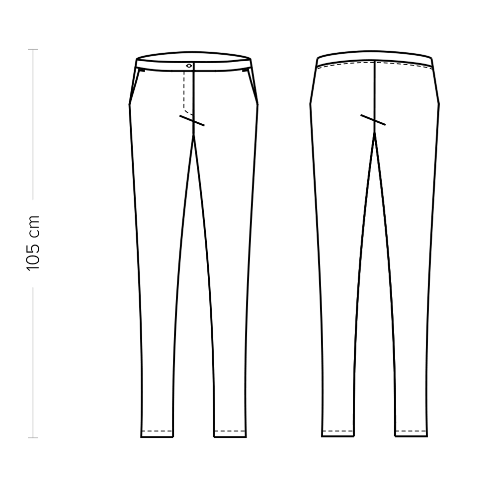 Il pantalone Rebecca ha vestibilitร Slim Fit, abbottonatura centrale coperta e due tasche nei fianchi con apertura alla francese. Un elastico importante nel retro del fascione fa aderire il pantalone alla schiena senza alcuna piega.