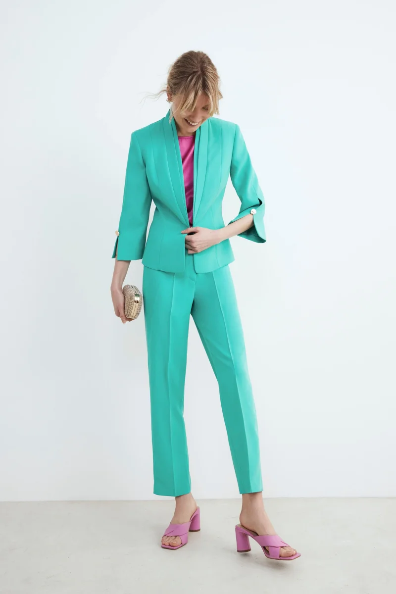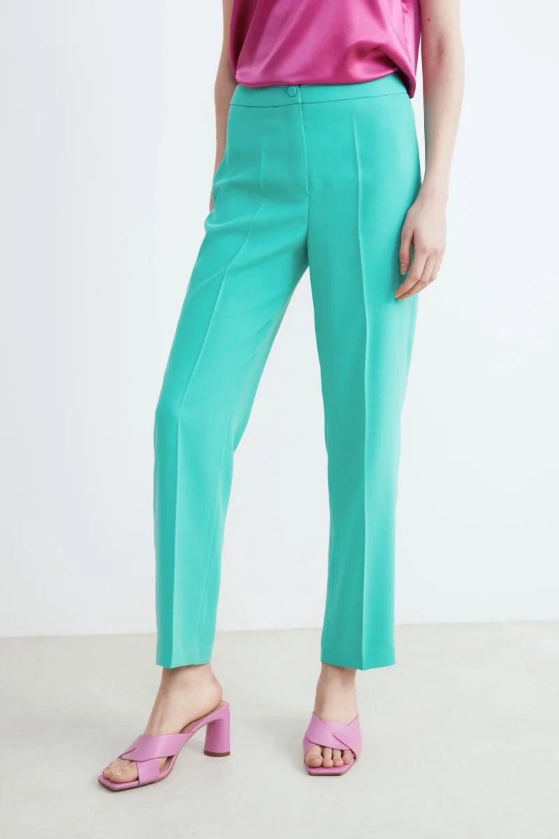 Pantaloni da donna eleganti a sigaretta senza tasche con chiusura 1 bottone frontale. Ideali in abbinamento con blazer della stessa fantasia. Vestibilitร slim. Made in Italy. La modella รจ alta 175 cm e indossa la taglia 40.