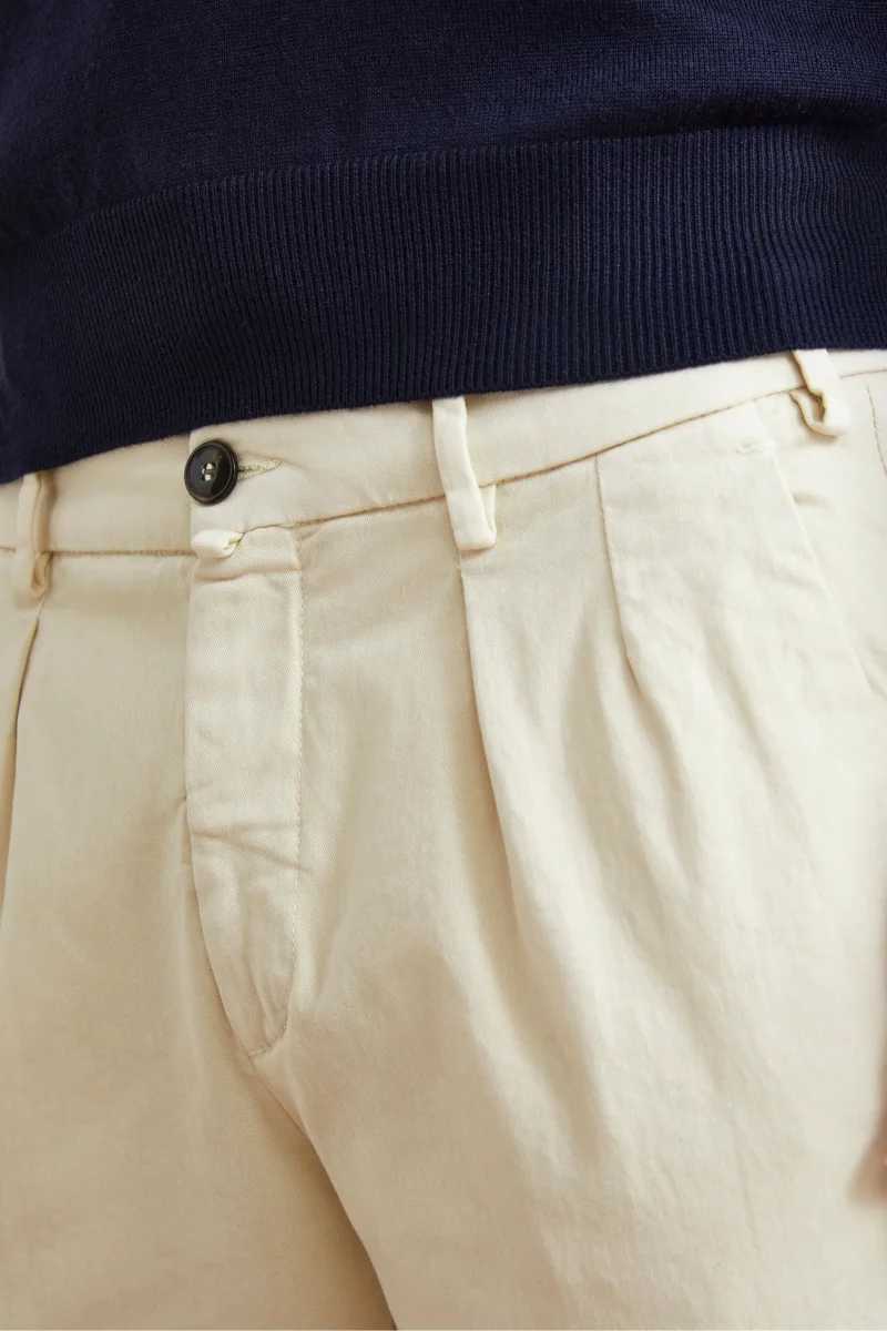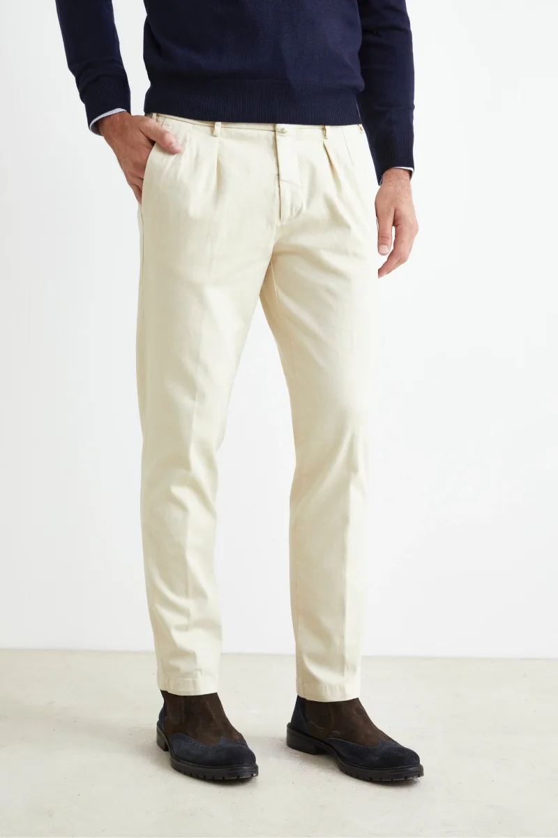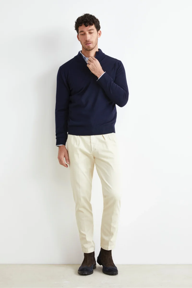 Il pantalone stretch slim fit con pinces รจ il perfetto equilibrio tra stile e comfort. Realizzato in cotone gabardina stretch, questo pantalone da uomo offre una vestibilitร aderente che valorizza la silhouette, garantendo al contempo libertร di movimento grazie alla naturale elasticitร del tessuto. Dotato di pratiche tasche america e doppia tasca posteriore, presenta anche una doppia pinces sul davanti che aggiunge un tocco di eleganza classica. I passanti per cintura lo rendono ideale da abbinare a cinture in pelle o tessuto. Parte della raffinata collezione IL Lanificio, questo capo Made in Italy รจ perfetto per ogni occasione. Per un look casual ma raffinato, abbina questo pantalone a una camicia in cotone o a una maglia girocollo. Se invece desideri un look piรน formale, indossalo con una giacca monopetto e scarpe eleganti. Qualunque sia la tua scelta, questi pantaloni saranno il capo ideale per il tuo guardaroba. Il modello รจ alto 189 cm e indossa la taglia 50.