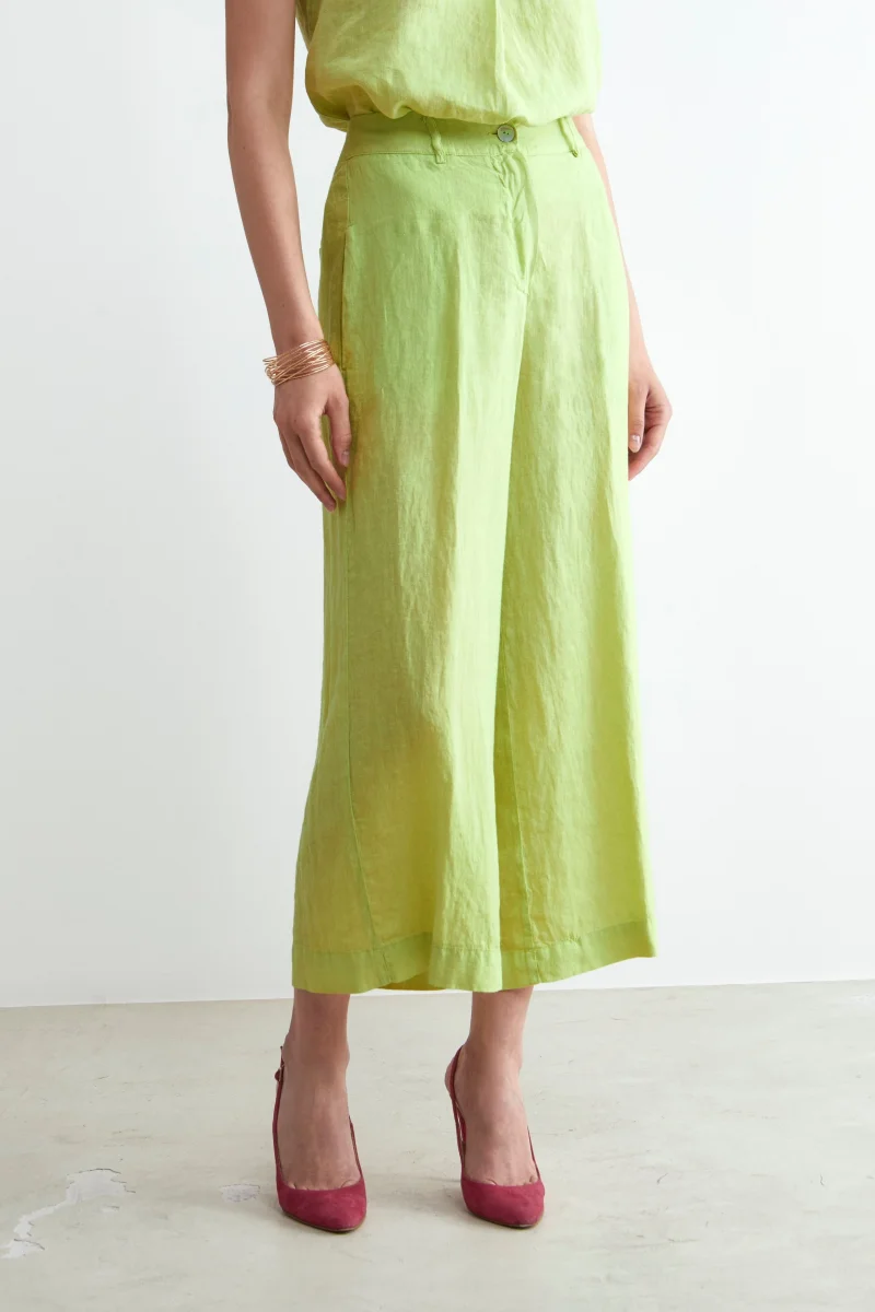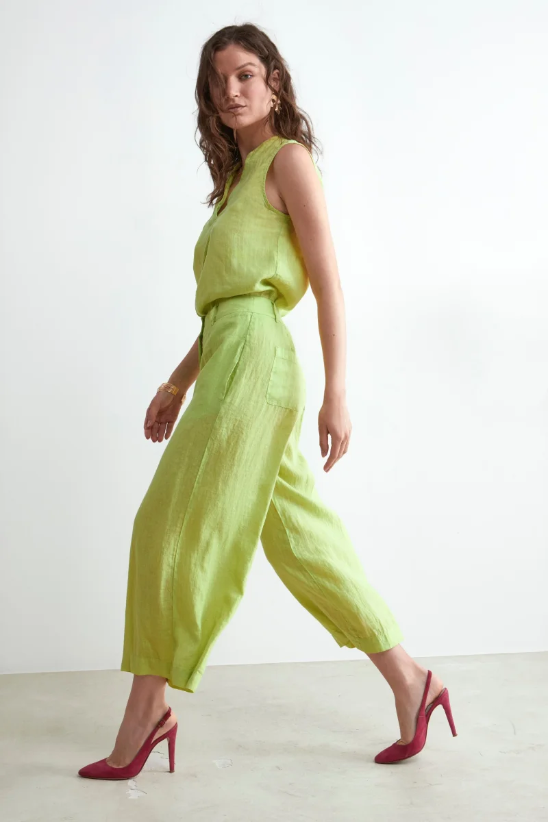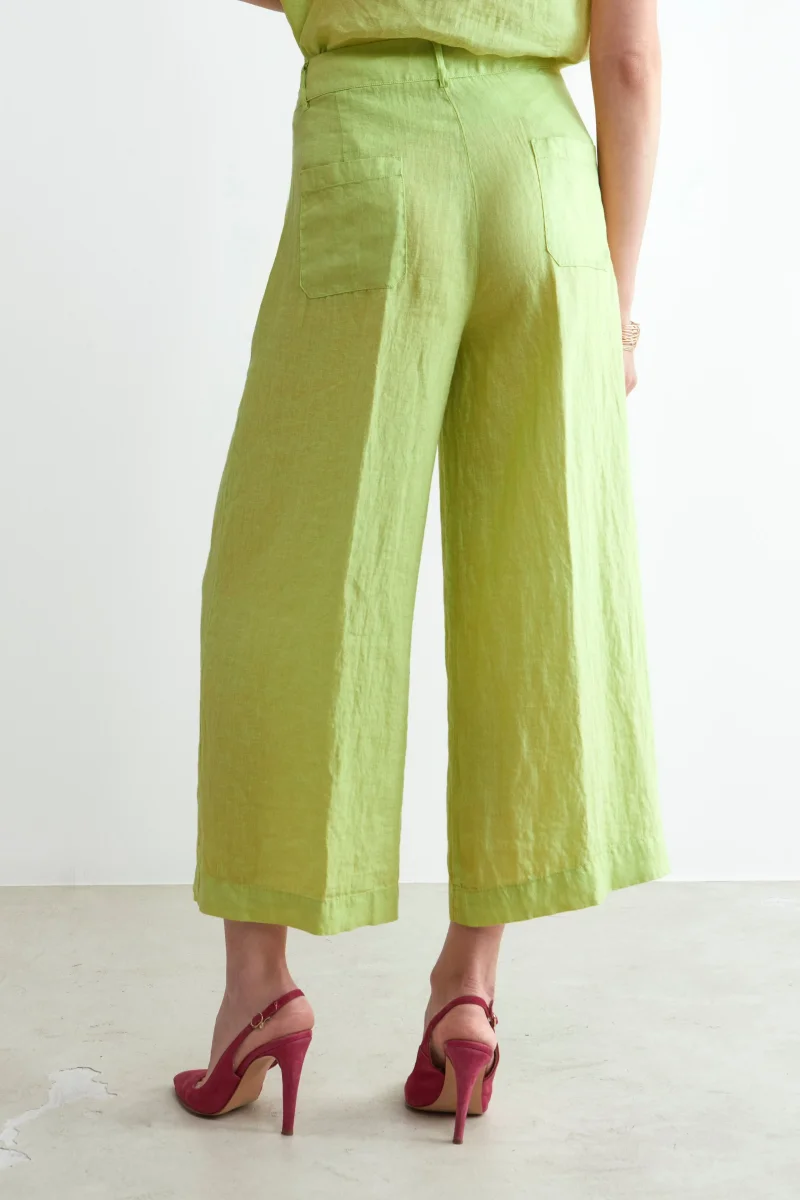 Pantalone ampio in puro lino con pinces frontali. Realizzato con chiusura con bottone e zip, cintura con passanti e pratiche tasche applicate posteriori. Taglio leggermente cropped, lunghezza al polpaccio. Pantalone di lino ideale per look piรน sportivi. Made in Italy. La modella รจ alta 177 cm e indossa la taglia 40.